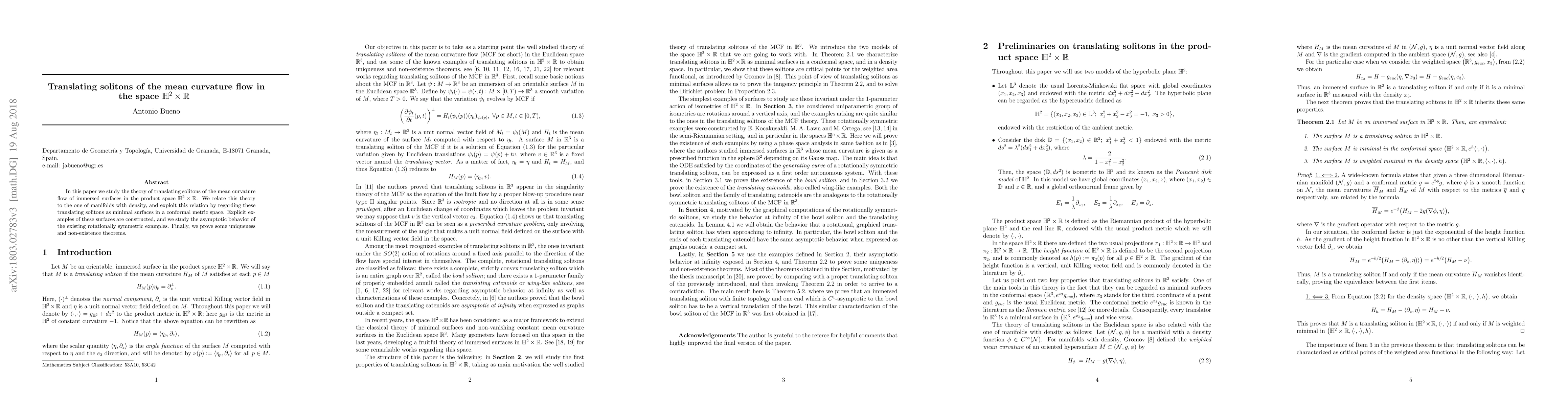In this paper we study the theory of self translating solitons of the mean curvature flow of immersed surfaces in the product space $\mathbb{H}^2\times\mathbb{R}$. We relate this theory to the one of manifolds with density, and exploit this relation by regarding these translating solitons as minimal surfaces in a conformal metric space. Explicit examples of these surfaces are constructed, and we study the asymptotic behaviour of the existing rotationally symmetric examples. Finally, we prove some uniqueness and non-existence theorems.