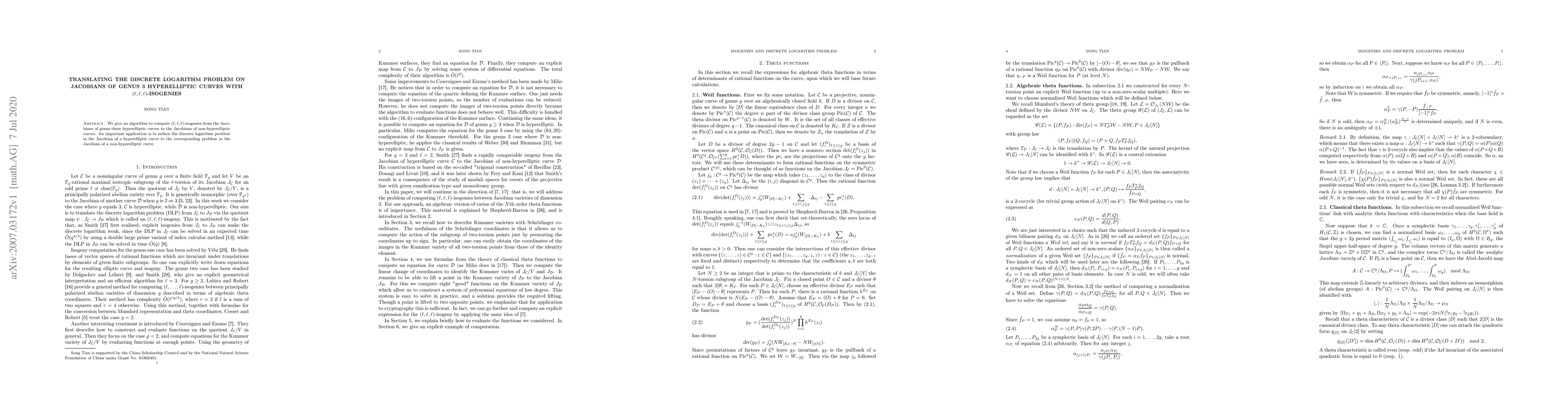 This paper presents an algorithm for computing $(\ell,\ell,\ell)$-isogenies between genus three hyperelliptic and non-hyperelliptic curves, facilitating the reduction of the discrete logarithm problem on hyperelliptic curves to that on non-hyperelliptic curves.