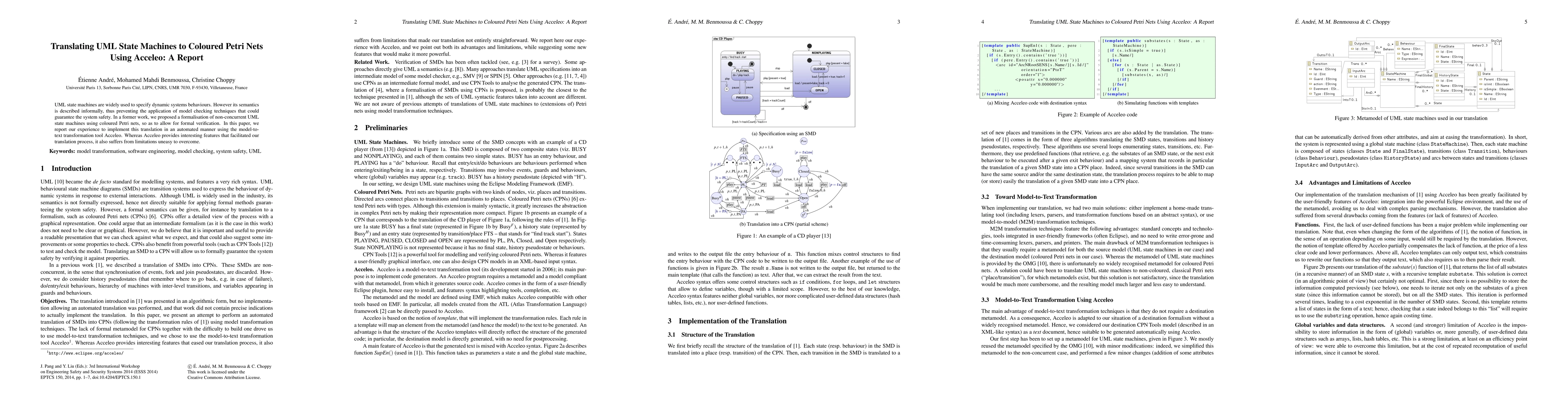 This paper describes the automated translation of UML state machines to Coloured Petri Nets using the Acceleo tool, aiming to enable formal verification for dynamic system behaviors. Despite Acceleo's helpful features, the authors encounter significant limitations in the translation process.