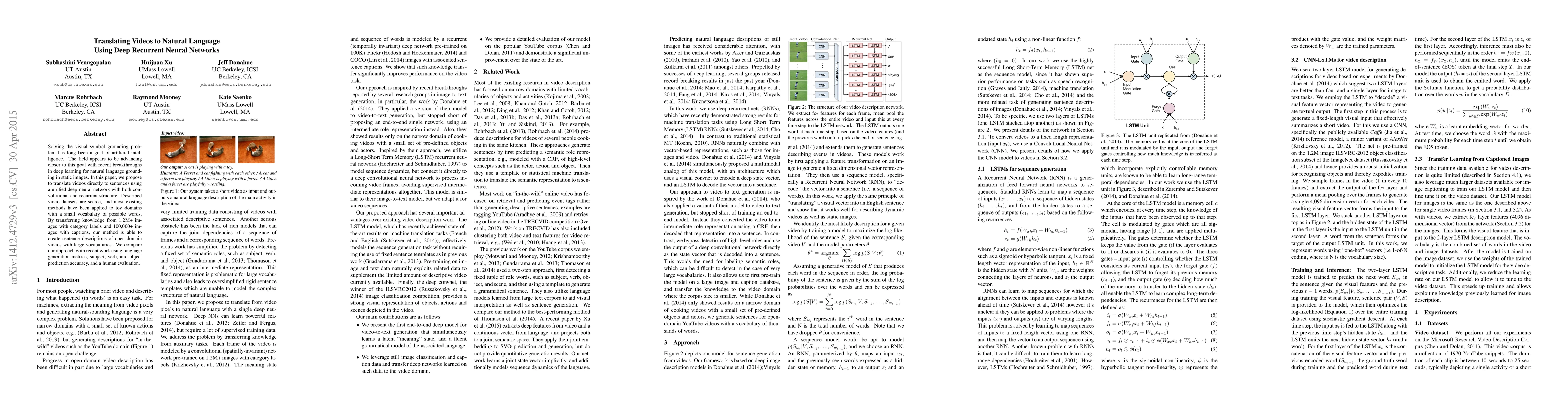 This paper proposes a deep neural network combining convolutional and recurrent structures to translate videos directly into natural language sentences, leveraging transferred knowledge from large image datasets to describe open-domain videos with extensive vocabularies. The method is evaluated against recent approaches using language generation metrics and human evaluations.