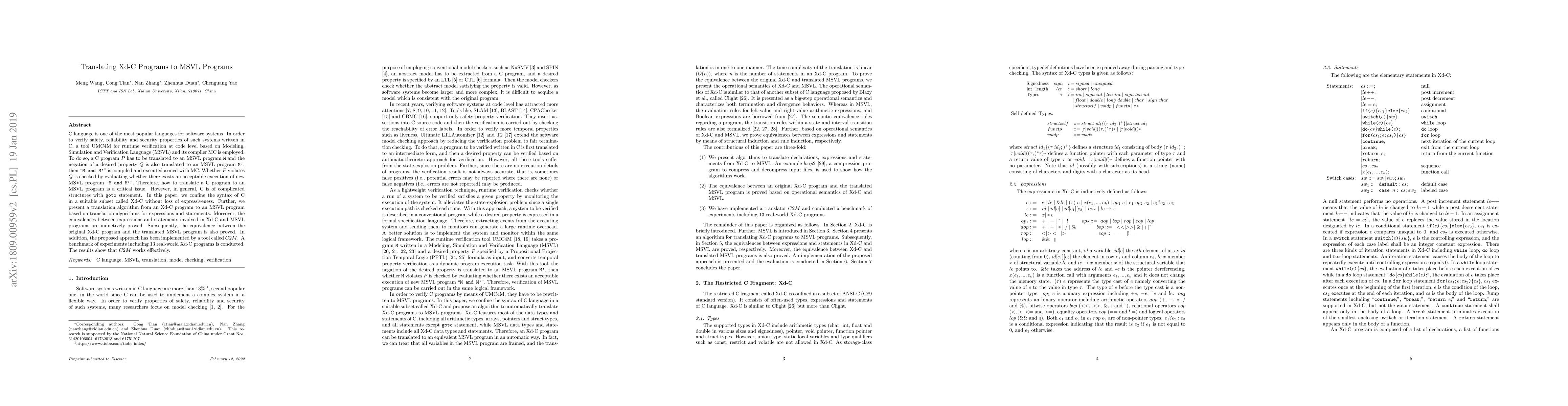 C language is one of the most popular languages for software systems. In order to verify safety, reliability and security properties of such systems written in C, a tool UMC4M for runtime verification at code level based on Modeling, Simulation and Verification Language (MSVL) and its compiler MC is employed. To do so, a C program $P$ has to be translated to an MSVL program M and the negation of a desired property $Q$ is also translated to an MSVL program M', then "M and M" is compiled and executed armed with MC. Whether $P$ violates $Q$ is checked by evaluating whether there exists an acceptable execution of new MSVL program M and M". Therefore, how to translate a C program to an MSVL program is a critical issue. However, in general, C is of complicated structures with goto statement. In this paper, we confine the syntax of C in a suitable subset called Xd-C without loss of expressiveness. Further, we present a translation algorithm from an Xd-C program to an MSVL program based on translation algorithms for expressions and statements. Moreover, the equivalences between expressions and statements involved in Xd-C and MSVL programs are inductively proved. Subsequently, the equivalence between the original Xd-C program and the translated MSVL program is also proved. In addition, the proposed approach has been implemented by a tool called $C2M$. A benchmark of experiments including 13 real-world Xd-C programs is conducted. The results show that $C2M$ works effectively.