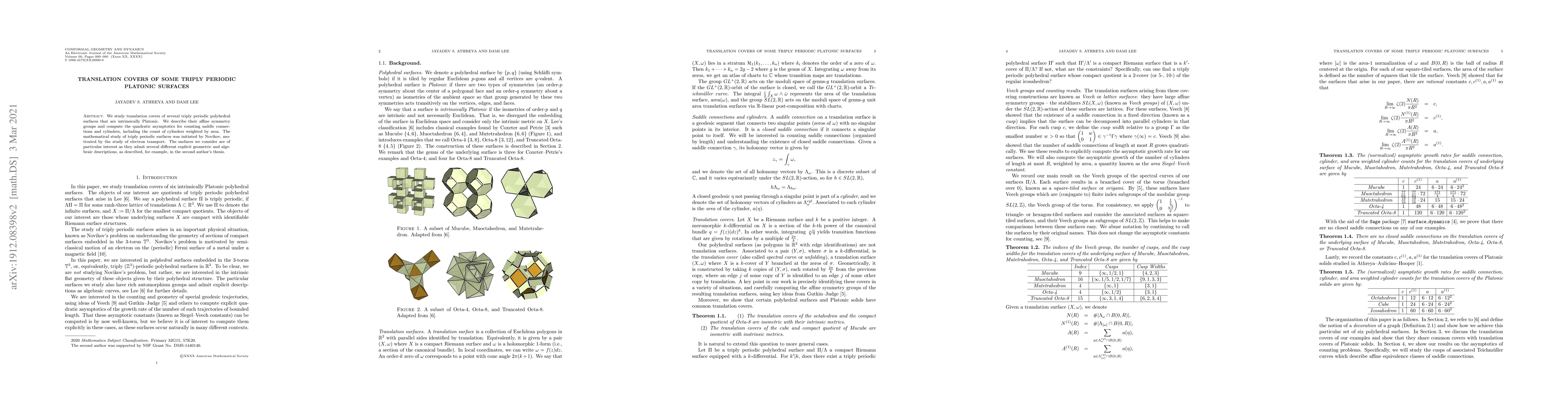 The paper investigates translation covers of triply periodic Platonic surfaces, detailing their affine symmetry groups and computing the asymptotics for saddle connections and cylinders, weighted by area. The study builds on Novikov's work on electron transport and explores surfaces with multiple geometric and algebraic descriptions.