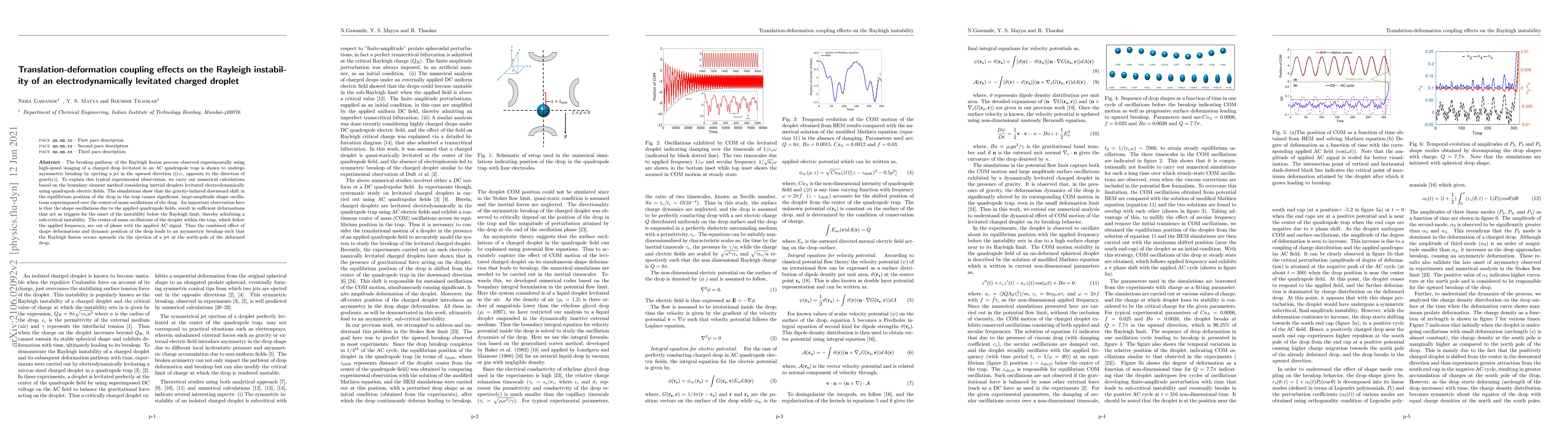 This study investigates the Rayleigh instability in electrodynamically levitated charged droplets using high-speed imaging and numerical simulations. The research reveals that shape oscillations induced by quadrupole fields trigger sub-critical instability, leading to an asymmetric upward breakup via jet ejection.