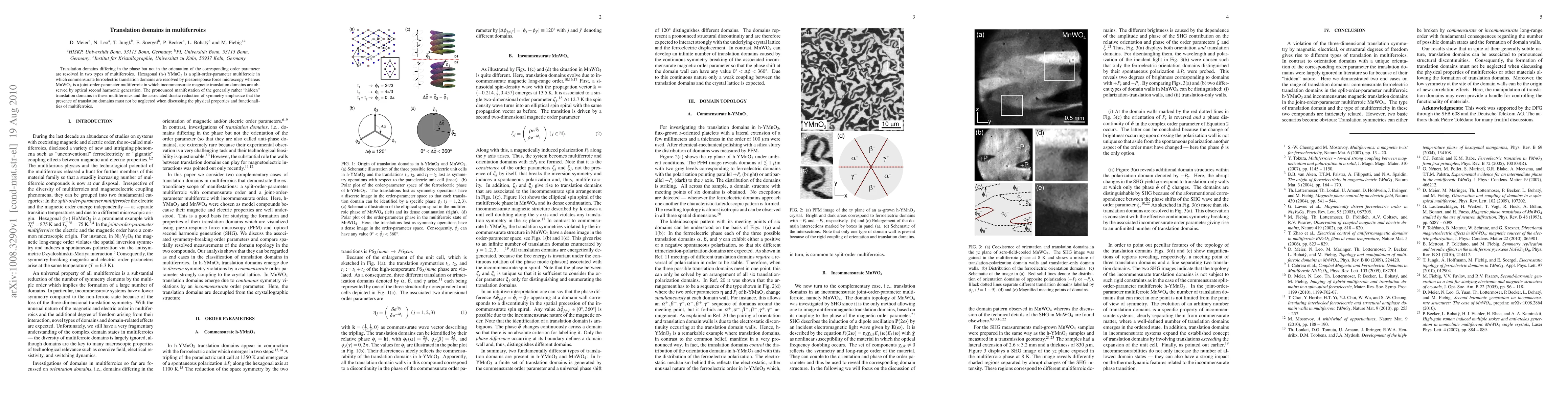 Translation domains differing in the phase but not in the orientation of the corresponding order parameter are resolved in two types of multiferroics. Hexagonal (h-) YMnO$_3$ is a split-order-parameter multiferroic in which commensurate ferroelectric translation domains are resolved by piezoresponse force microscopy whereas MnWO$_4$ is a joint-order-parameter multiferroic in which incommensurate magnetic translation domains are observed by optical second harmonic generation. The pronounced manifestation of the generally rather "hidden" translation domains in these multiferroics and the associated drastic reduction of symmetry emphasize that the presence of translation domains must not be neglected when discussing the physical properties and functionalities of multiferroics.