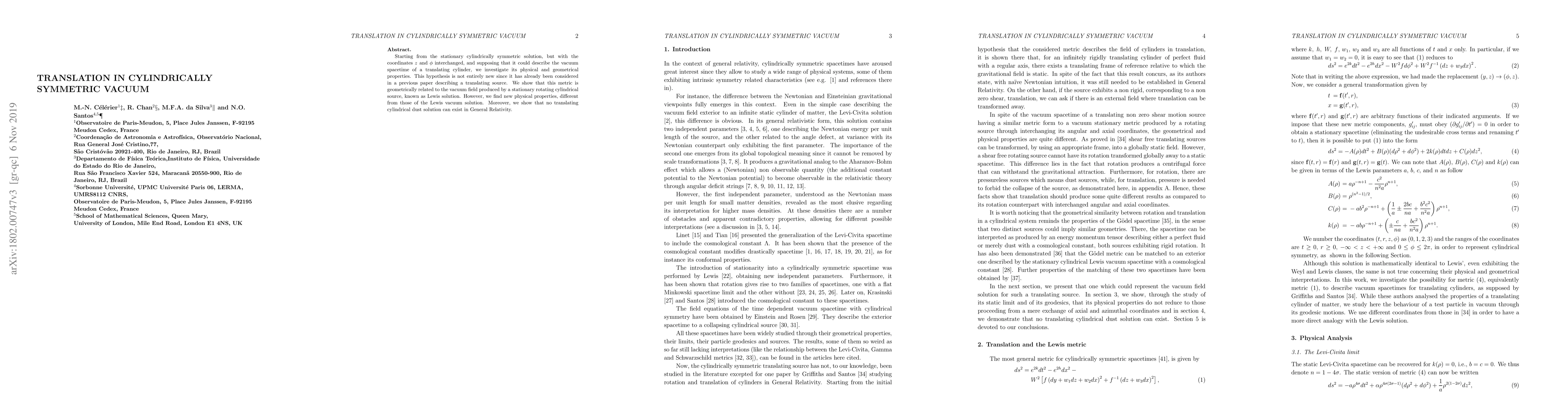 Starting from the stationary cylindrically symmetric solution, but with the coordinates $z$ and $\phi$ interchanged, and supposing that it could describe the vacuum spacetime of a translating cylinder, we investigate its physical and geometrical properties. This hypothesis is not entirely new since it has already been considered in a previous paper describing a translating source. We show that this metric is geometrically related to the vacuum field produced by a stationary rotating cylindrical source{, known as Lewis solution. However, we find new physical properties, different from those of the Lewis vacuum solution. Moreover, we show that no translating cylindrical dust solution can exist in General Relativity.
