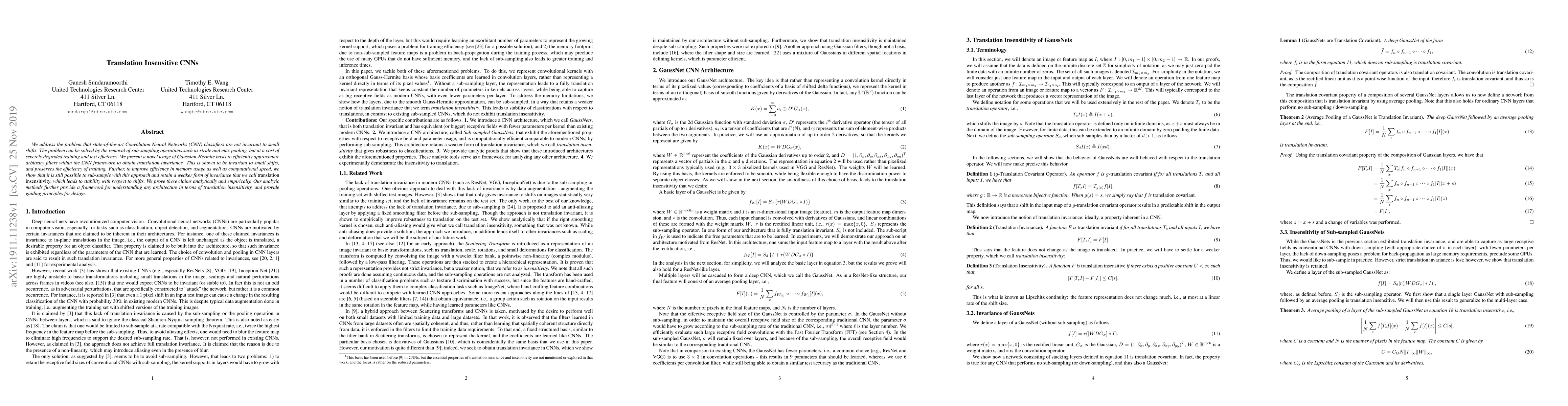 This paper proposes a novel method using Gaussian-Hermite basis to achieve translation invariance in CNNs without sacrificing training efficiency. It introduces a translation-insensitive approach that allows for sub-sampling while maintaining stability against small shifts, supported by both analytical proofs and empirical validation.
