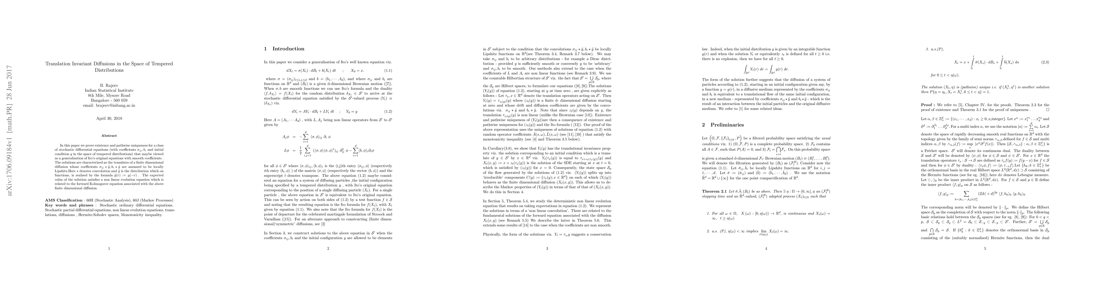 In this paper we prove existence and pathwise uniqueness for a class of stochastic differential equations (with coefficients $\sigma_{ij},b_i$ and initial condition $y$ in the space of tempered distributions) that maybe viewed as a generalisation of Ito's original equations with smooth coefficients . The solutions are characterized as the translates of a finite dimensional diffusion whose coefficients $\sigma_{ij}\star \tilde{y},b_i\star \tilde{y}$ are assumed to be locally Lipshitz.Here $\star$ denotes convolution and $\tilde{y}$ is the distribution which on functions, is realised by the formula $\tilde{y}(r) := y(-r)$ . The expected value of the solution satisfies a non linear evolution equation which is related to the forward Kolmogorov equation associated with the above finite dimensional diffusion.