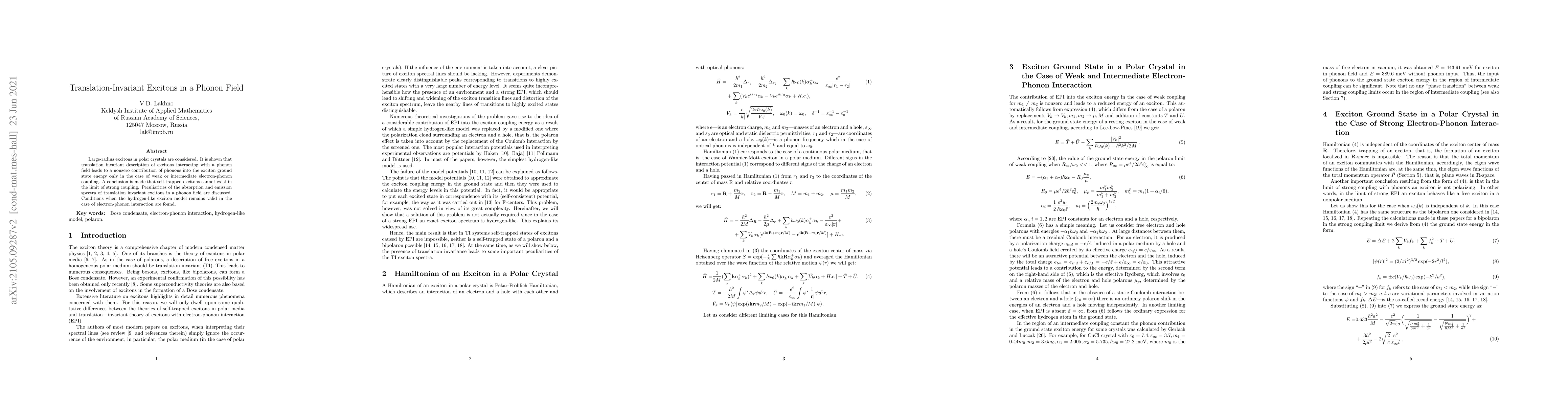 Researchers found that only weak or intermediate electron-phonon coupling allows for phonons to contribute to exciton ground state energy, ruling out self-trapped excitons in strong coupling cases.