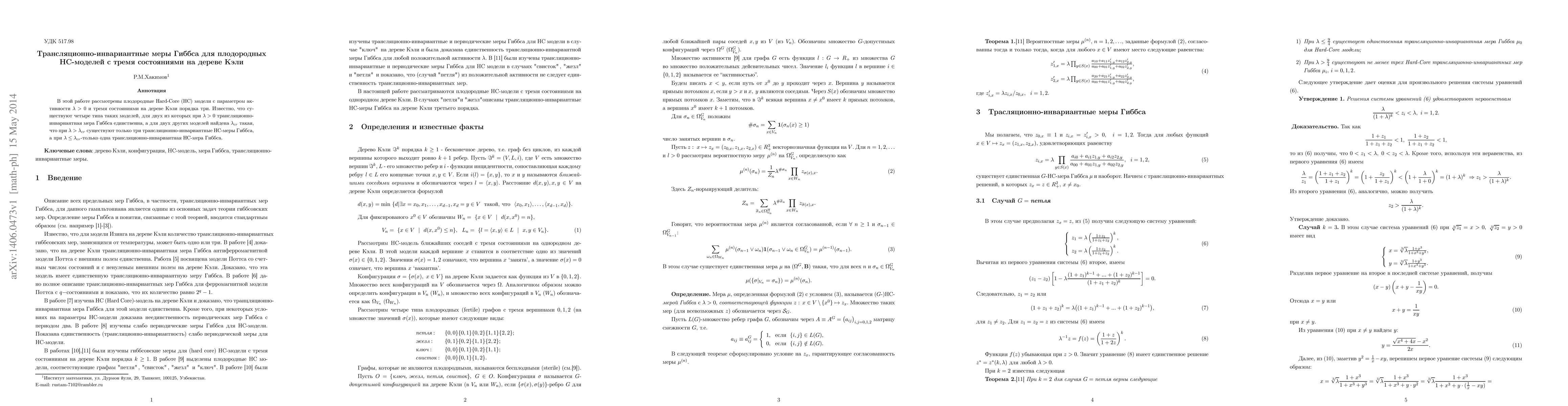 This paper investigates fertile HC-models with three states on a Cayley tree, identifying four distinct types, and describes the translation-invariant Gibbs measures for these models on a Cayley tree of order three.
