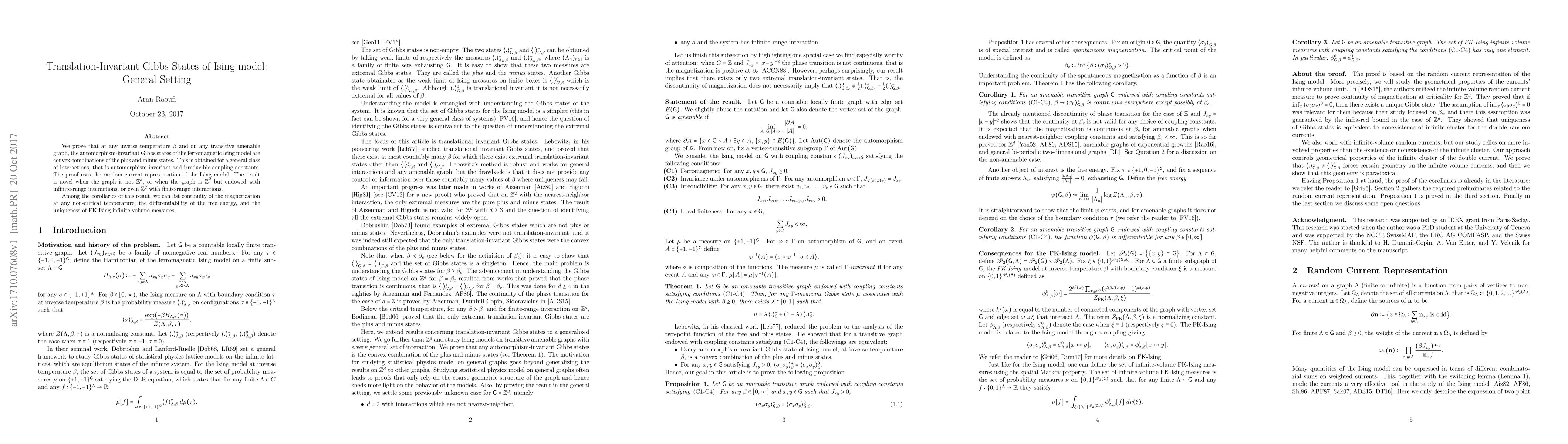 This paper proves that on any transitive amenable graph, the automorphism-invariant Gibbs states of the ferromagnetic Ising model are convex combinations of the plus and minus states, using the random current representation. This result extends to general interactions and is novel for non-$\mathbb{Z}^d$ graphs, infinite-range interactions on $\mathbb{Z}^d$, and finite-range interactions on $\mathbb{Z}^2$.