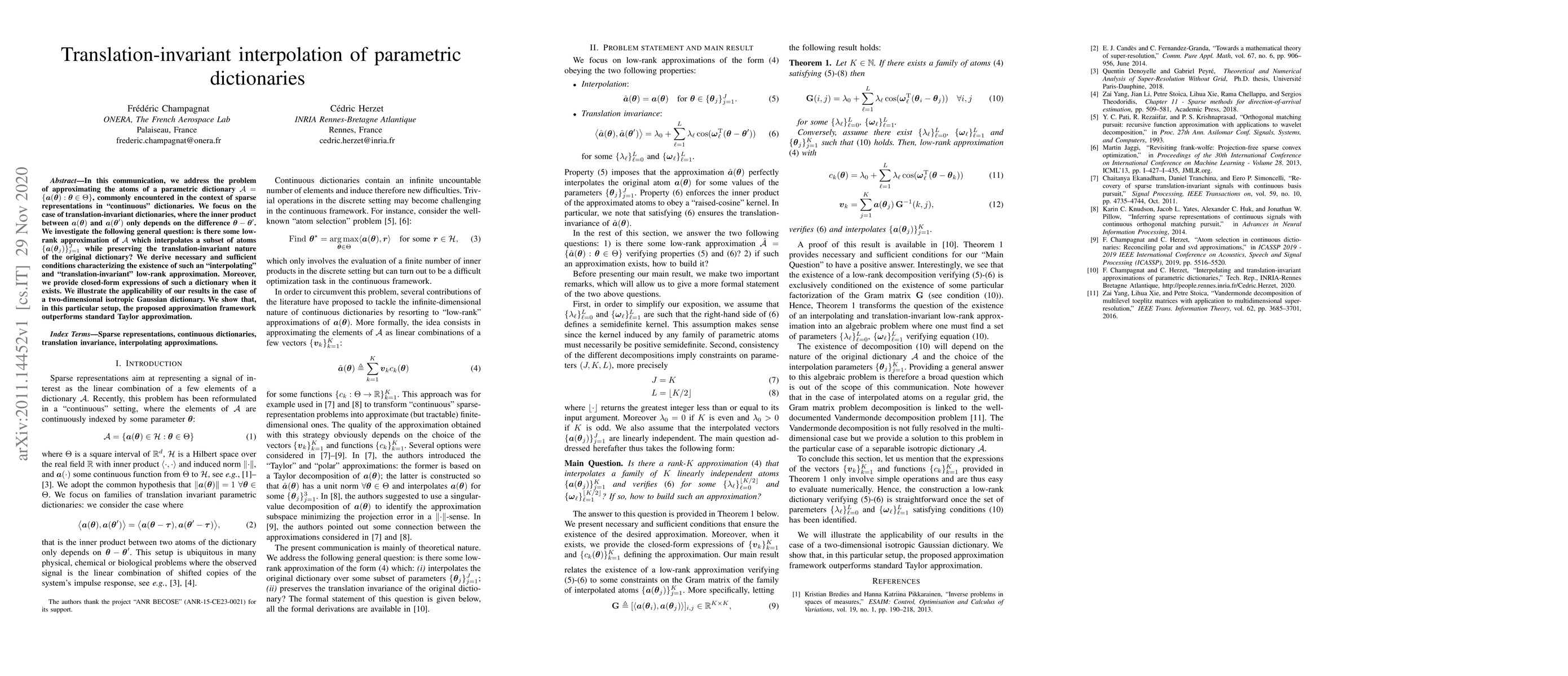 In this communication, we address the problem of approximating the atoms of a parametric dictionary, commonly encountered in the context of sparse representations in "continuous" dictionaries. We focus on the case of translation-invariant dictionaries, where the inner product between atoms only depends on the difference between parameters. We investigate the following general question: is there some low-rank approximation of the dictionary $ which interpolates a subset of atoms while preserving the translation-invariant nature of the original dictionary? We derive necessary and sufficient conditions characterizing the existence of such an "interpolating" and "translation-invariant" low-rank approximation. Moreover, we provide closed-form expressions of such a dictionary when it exists. We illustrate the applicability of our results in the case of a two-dimensional isotropic Gaussian dictionary. We show that, in this particular setup, the proposed approximation framework outperforms standard Taylor approximation.