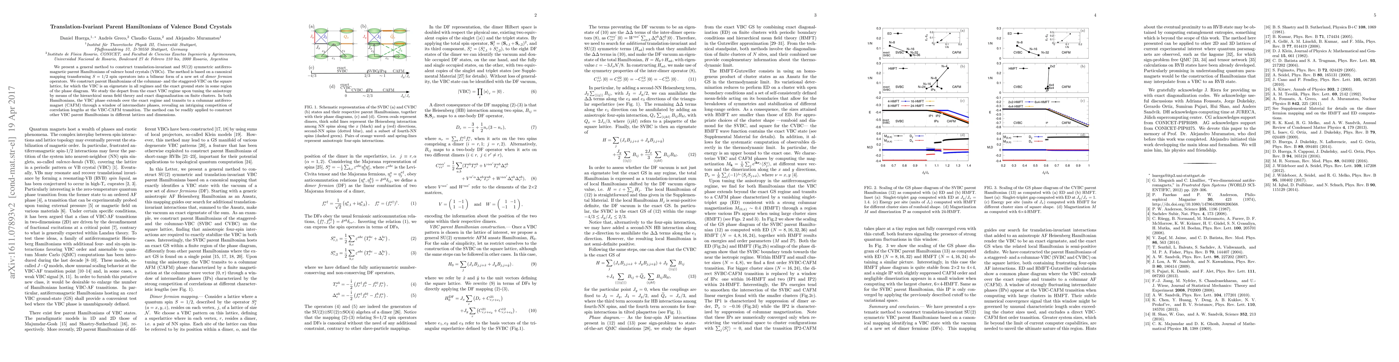 This paper introduces a method for constructing translation-invariant and SU(2) symmetric antiferromagnetic parent Hamiltonians for valence bond crystals, transforming spin operators into dimer fermion operators. It applies the method to columnar and staggered VBC on square lattices, revealing a transition from exact VBC to columnar antiferromagnet through intermediate phases.