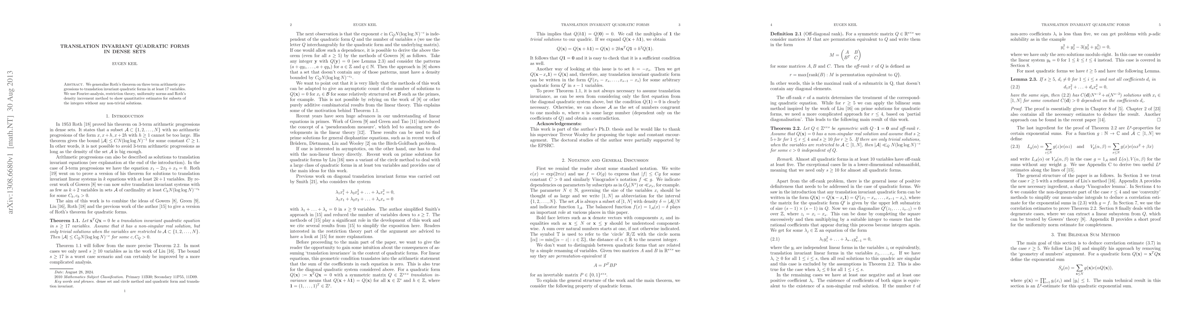 We generalize Roth's theorem on three term arithmetic progressions to translation invariant quadratic forms in at least 17 variables. We use Fourier-analysis, restriction theory, uniformity norms and Roth's density increment method to show quantitative estimates for subsets of the integers without any non-trivial solutions.