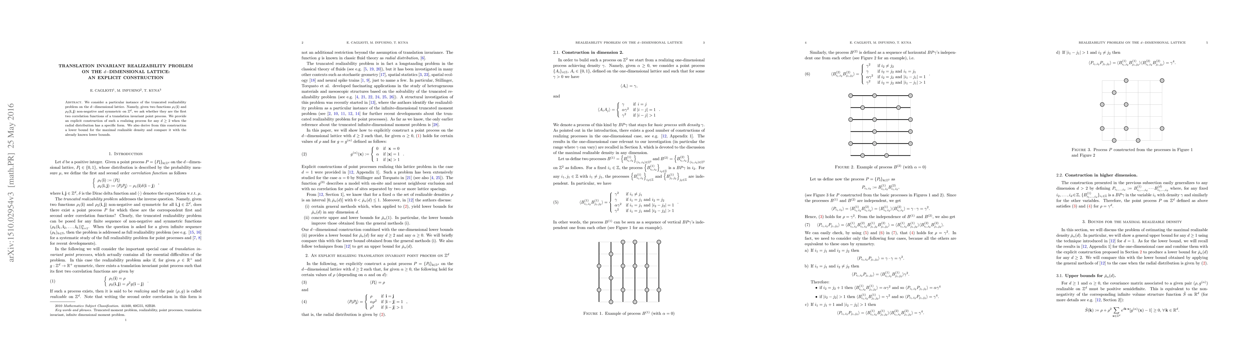 We consider a particular instance of the truncated realizability problem on the $d-$dimensional lattice. Namely, given two functions $\rho_1({\bf i})$ and $\rho_2({\bf i},{\bf j})$ non-negative and symmetric on $\mathbb{Z}^d$, we ask whether they are the first two correlation functions of a translation invariant point process. We provide an explicit construction of such a realizing process for any $d\geq 2$ when the radial distribution has a specific form. We also derive from this construction a lower bound for the maximal realizable density and compare it with the already known lower bounds.