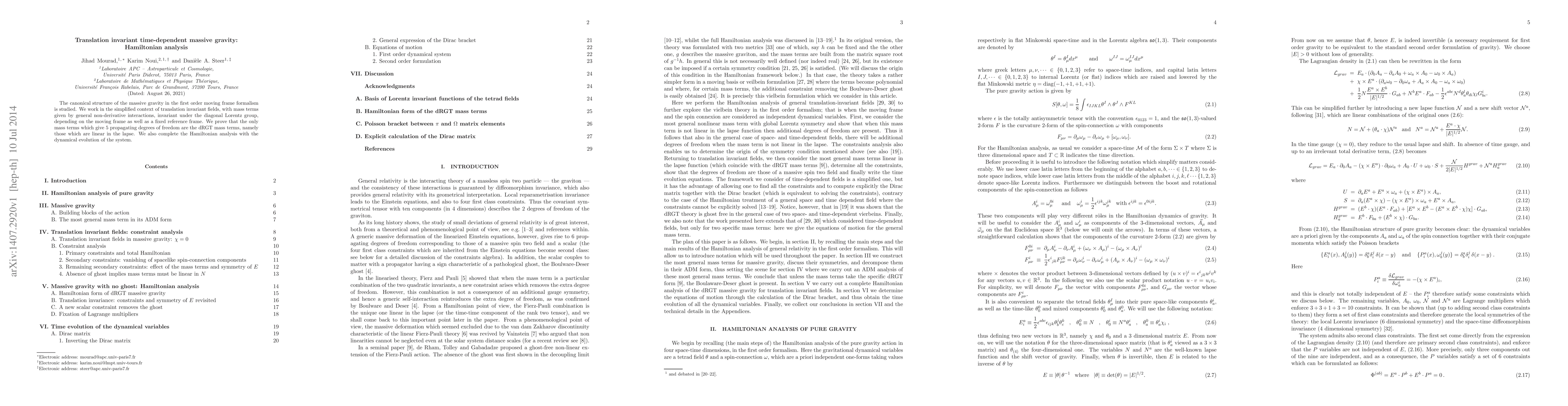 The canonical structure of the massive gravity in the first order moving frame formalism is studied. We work in the simplified context of translation invariant fields, with mass terms given by general non-derivative interactions, invariant under the diagonal Lorentz group, depending on the moving frame as well as a fixed reference frame. We prove that the only mass terms which give 5 propagating degrees of freedom are the dRGT mass terms, namely those which are linear in the lapse. We also complete the Hamiltonian analysis with the dynamical evolution of the system.
