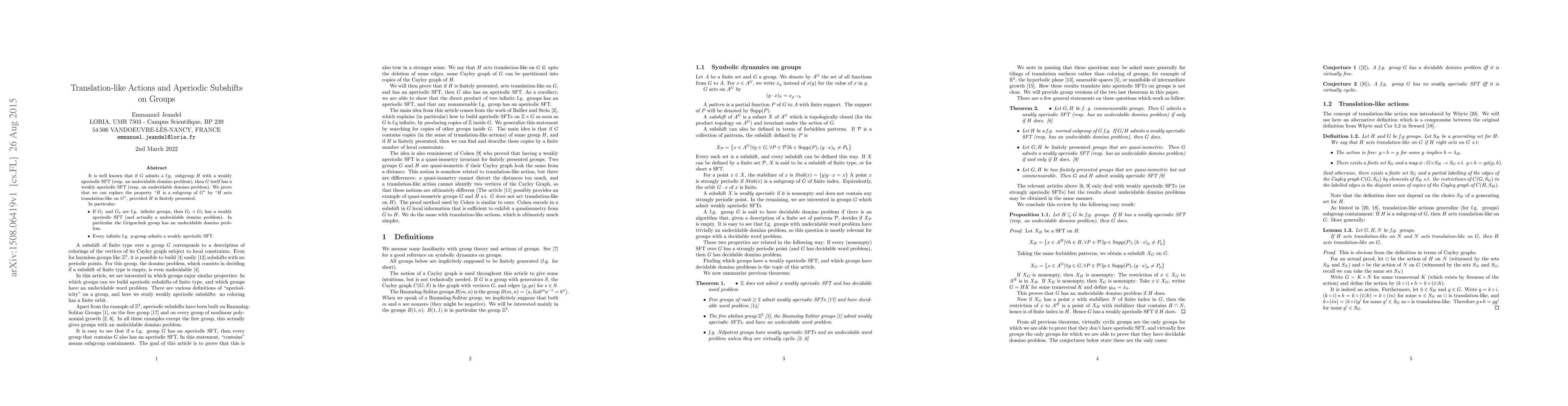 It is well known that if $G$ admits a f.g. subgroup $H$ with a weaklyaperiodic SFT (resp. an undecidable domino problem), then $G$itself has a weakly aperiodic SFT (resp. an undecidable domino problem).We prove that we can replace the property "$H$ is a subgroup of $G$"by "$H$ acts translation-like on $G$", provided $H$ is finitely presented.In particular:* If $G\_1$ and $G\_2$ are f.g. infinite groups, then $G\_1 \times G\_2$ has a weakly aperiodic SFT (and actually a undecidable domino problem). In particular the Grigorchuk group has an undecidable domino problem. * Every infinite f.g. $p$-group admits a weakly aperiodic SFT.