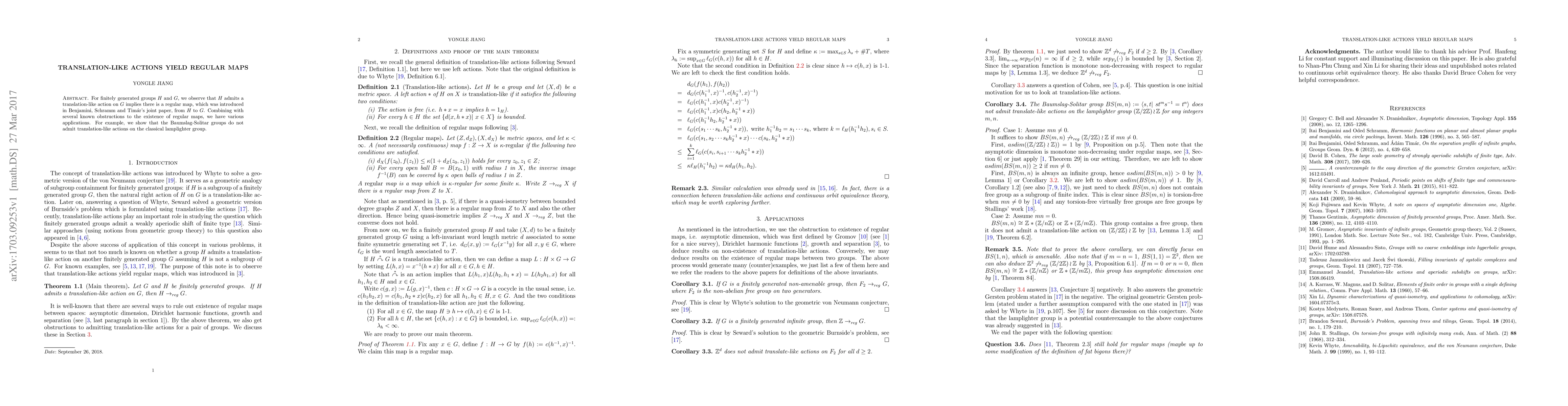 For finitely generated groups $H$ and $G$, we observe that $H$ admits a translation-like action on $G$ implies there is a regular map, which was introduced in Benjamini, Schramm and Tim\'{a}r's joint paper, from $H$ to $G$. Combining with several known obstructions to the existence of regular maps, we have various applications. For example, we show that the Baumslag-Solitar groups do not admit translation-like actions on the classical lamplighter group.