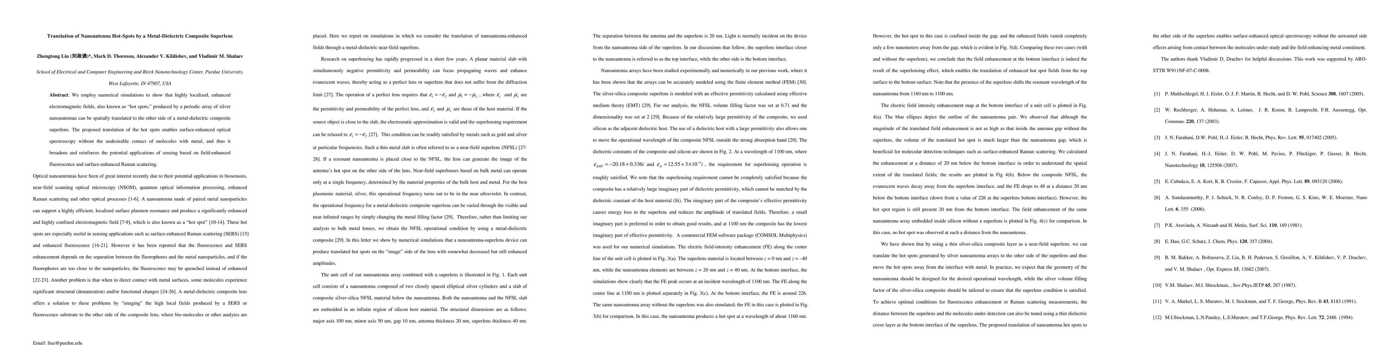 Summary: Numerical simulations demonstrate that "hot spots" from silver nanoantennas can be translated through a metal-dielectric composite superlens, enabling surface-enhanced spectroscopy without metal-molecule contact, thus enhancing applications in field-enhanced fluorescence and surface-enhanced Raman scattering.