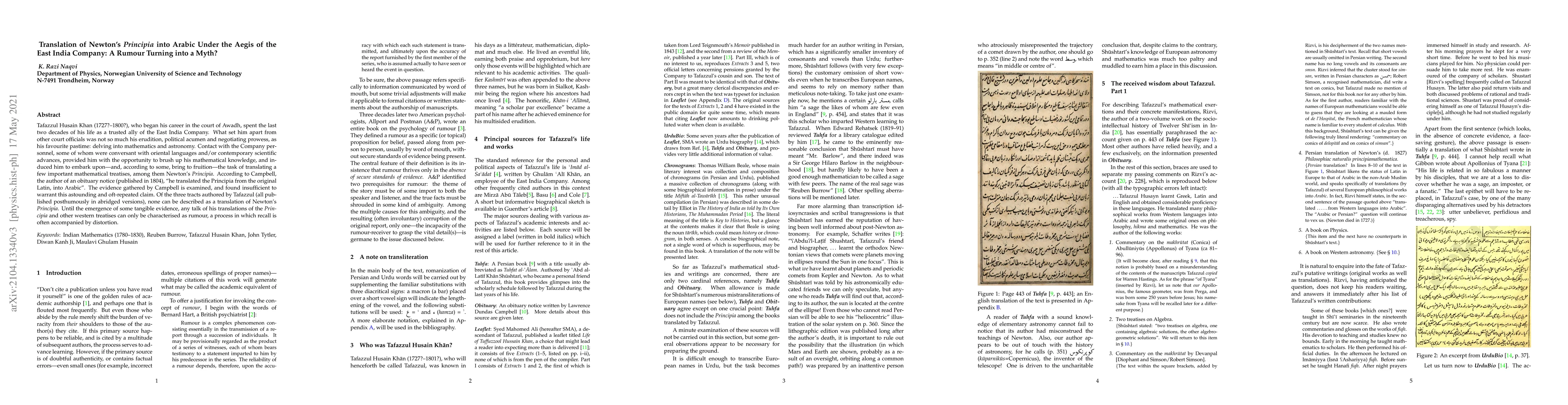 Tafazzul Husain Khan (1727?--1800?), who began his career in the court of Awadh, spent the last two decades of his life as a trusted ally of the East India Company. What set him apart from other court officials was not so much his erudition, political acumen and negotiating prowess, as his favourite pastime: delving into mathematics and astronomy. Contact with the Company personnel, some of whom were conversant with oriental languages and/or contemporary scientific advances, provided him with the opportunity to brush up his mathematical knowledge, and induced him to embark upon -- and, according to some, bring to fruition -- the task of translating a few important mathematical treatises, among them Newton's \textit{Principia}. According to Campbell, the author of an obituary notice (published in 1804), "he translated the Principia from the original Latin, into Arabic". The evidence gathered by Campbell is examined, and found insufficient to warrant this astounding and oft-repeated claim. Of the three tracts authored by Tafazzul (all published posthumously in abridged versions), none can be described as a translation of Newton's \textit{Principia}. Until the emergence of some tangible evidence, any talk of his translations of the \textit{Principia} and other western treatises can only be characterised as rumour, a process in which recall is often accompanied by distortion.