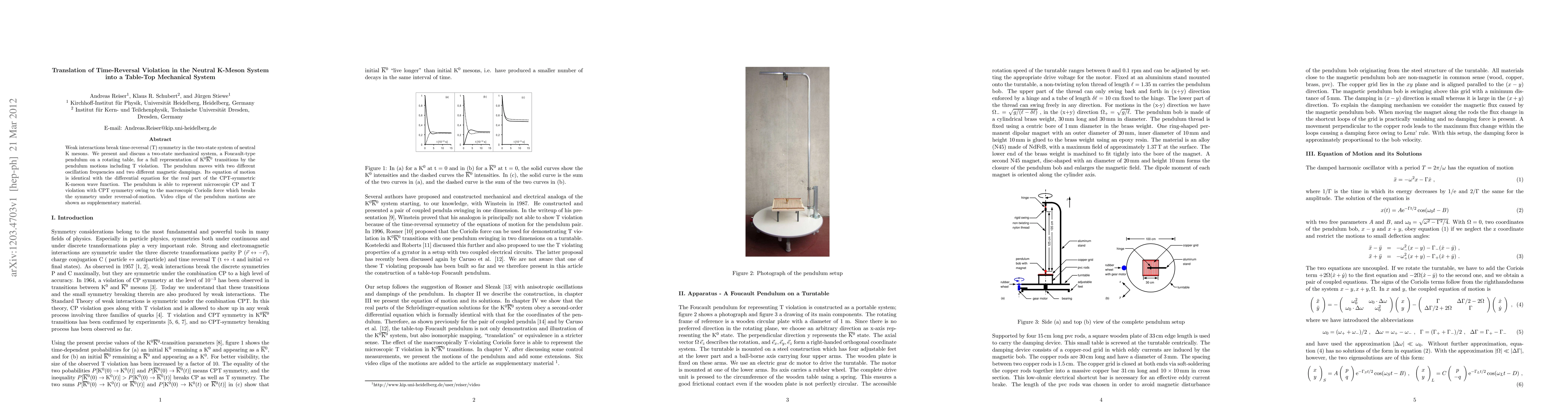 Researchers create a mechanical system to model time-reversal violation in neutral K-meson systems, successfully demonstrating CPT symmetry with Coriolis force.