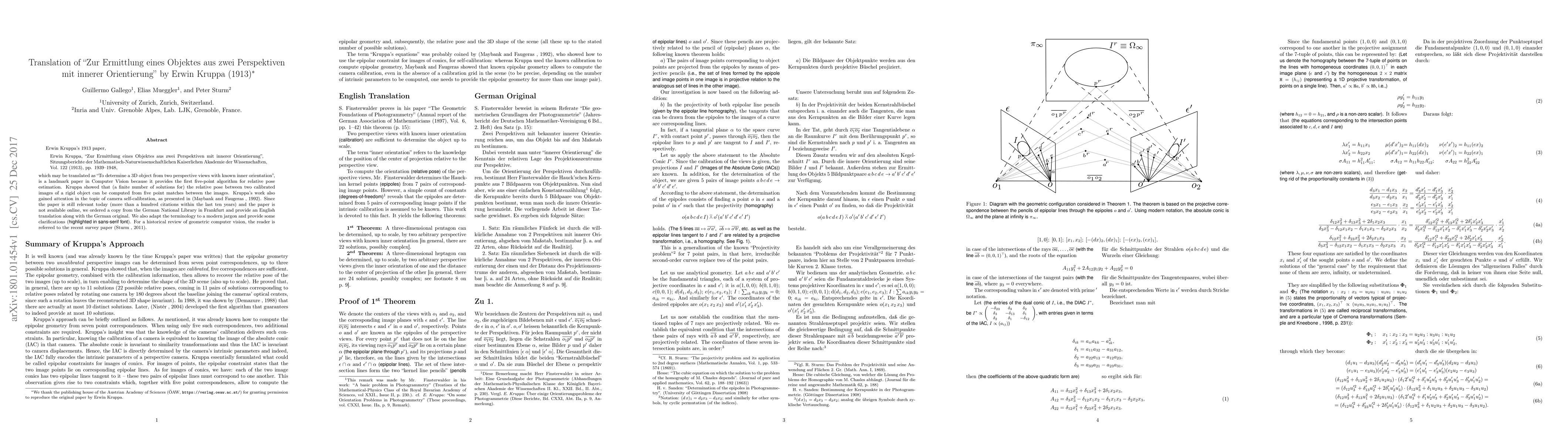 Erwin Kruppa's 1913 paper, Erwin Kruppa, "Zur Ermittlung eines Objektes aus zwei Perspektiven mit innerer Orientierung", Sitzungsberichte der Mathematisch-Naturwissenschaftlichen Kaiserlichen Akademie der Wissenschaften, Vol. 122 (1913), pp. 1939-1948, which may be translated as "To determine a 3D object from two perspective views with known inner orientation", is a landmark paper in Computer Vision because it provides the first five-point algorithm for relative pose estimation. Kruppa showed that (a finite number of solutions for) the relative pose between two calibrated images of a rigid object can be computed from five point matches between the images. Kruppa's work also gained attention in the topic of camera self-calibration, as presented in (Maybank and Faugeras, 1992). Since the paper is still relevant today (more than a hundred citations within the last ten years) and the paper is not available online, we ordered a copy from the German National Library in Frankfurt and provide an English translation along with the German original. We also adapt the terminology to a modern jargon and provide some clarifications (highlighted in sans-serif font). For a historical review of geometric computer vision, the reader is referred to the recent survey paper (Sturm, 2011).