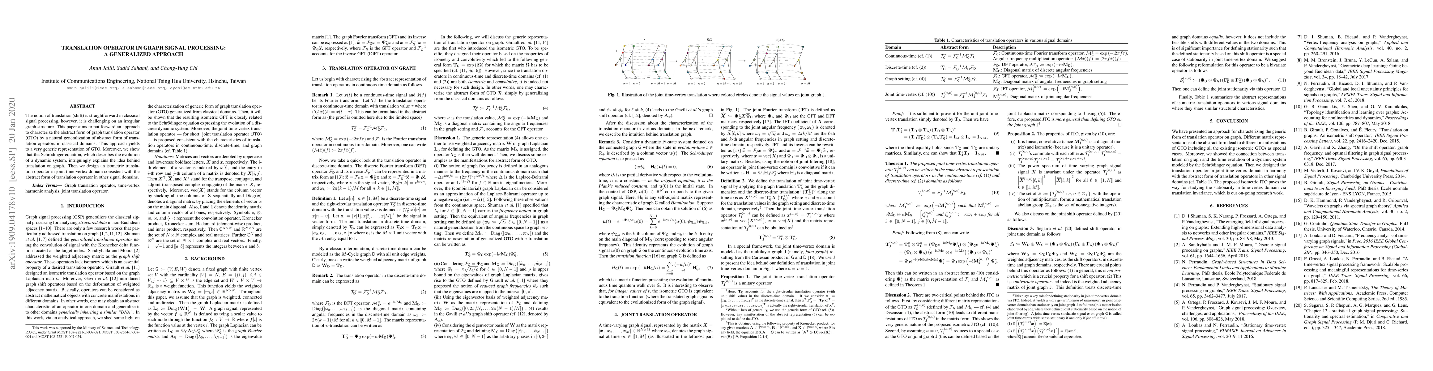 The notion of translation (shift) is straightforward in classical signal processing, however, it is challenging on an irregular graph structure. In this work, we present an approach to characterize the translation operator in various signal domains. By a natural generalization from classical domains, one can characterize an abstract representation for the graph translation operator. Then we propose an isometric translation operator in joint time-vertex domain consistent with the abstract form of translation operators in other domains. We also demonstrate the connection between this notion and the Schr\"{o}dinger equation on a dynamic system which intriguingly describes the idea behind translation on graph.