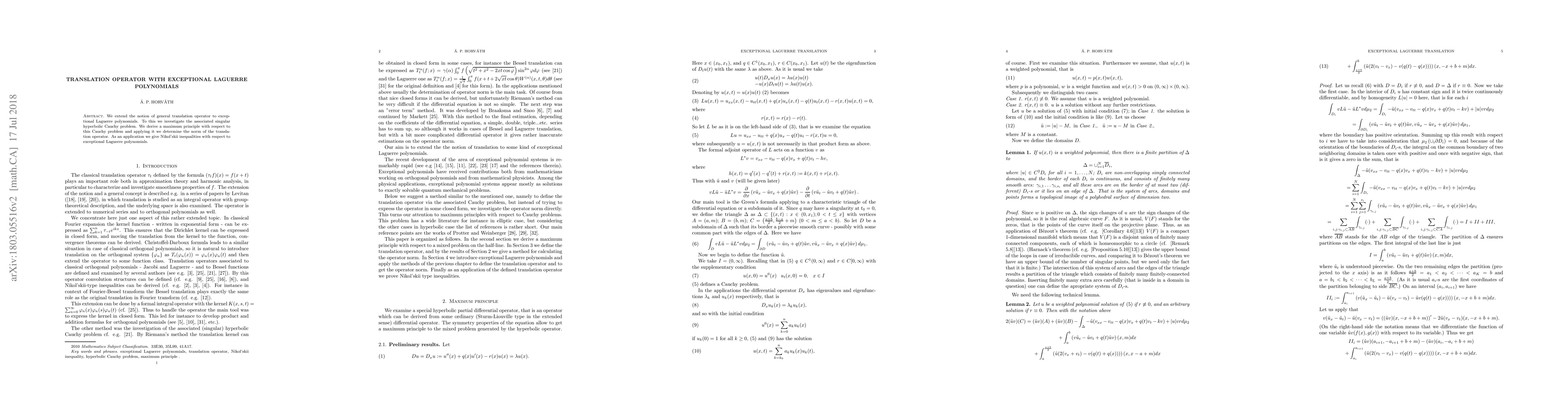 This paper extends the translation operator concept to exceptional Laguerre polynomials, deriving a maximum principle for the associated singular hyperbolic Cauchy problem and determining the norm of the translation operator. It also provides Nikol'skii inequalities for these exceptional Laguerre polynomials.