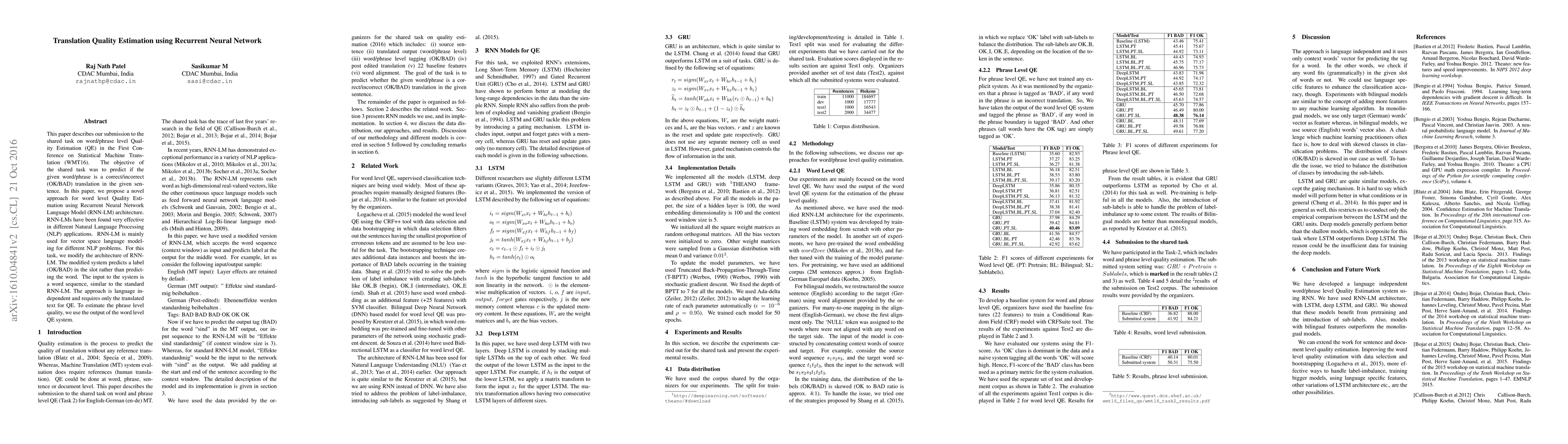 This paper proposes a Recurrent Neural Network Language Model (RNN-LM) for word level Quality Estimation in machine translation, predicting if translations are correct or incorrect. The approach is extended to phrase level by aggregating word level predictions.