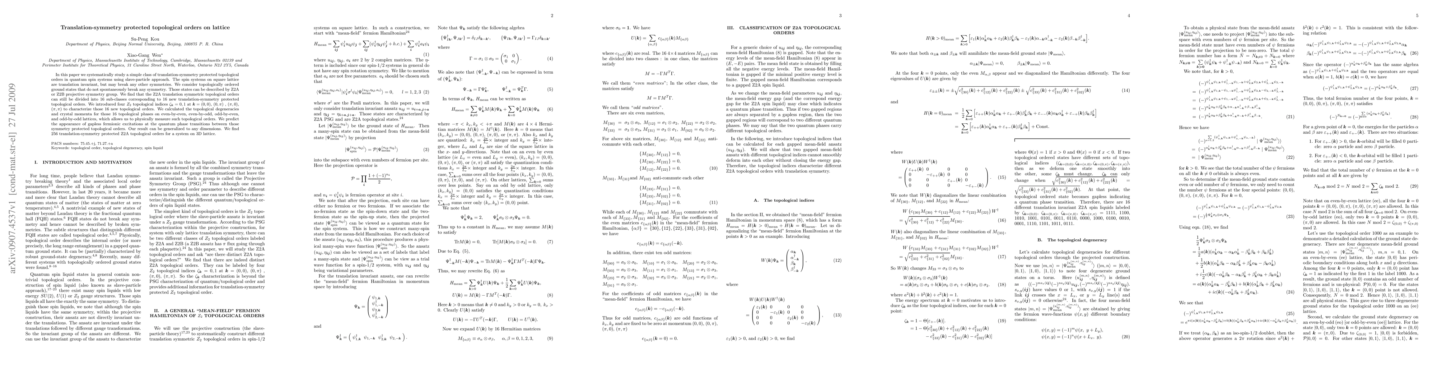 This paper explores translation-symmetry protected topological orders in quantum spin systems on lattices, introducing a classification of 16 new orders in 2D and 256 in 3D using the Z2A projective symmetry group. It characterizes these orders with four $Z_2$ topological indices and predicts gapless fermionic excitations at phase transitions.