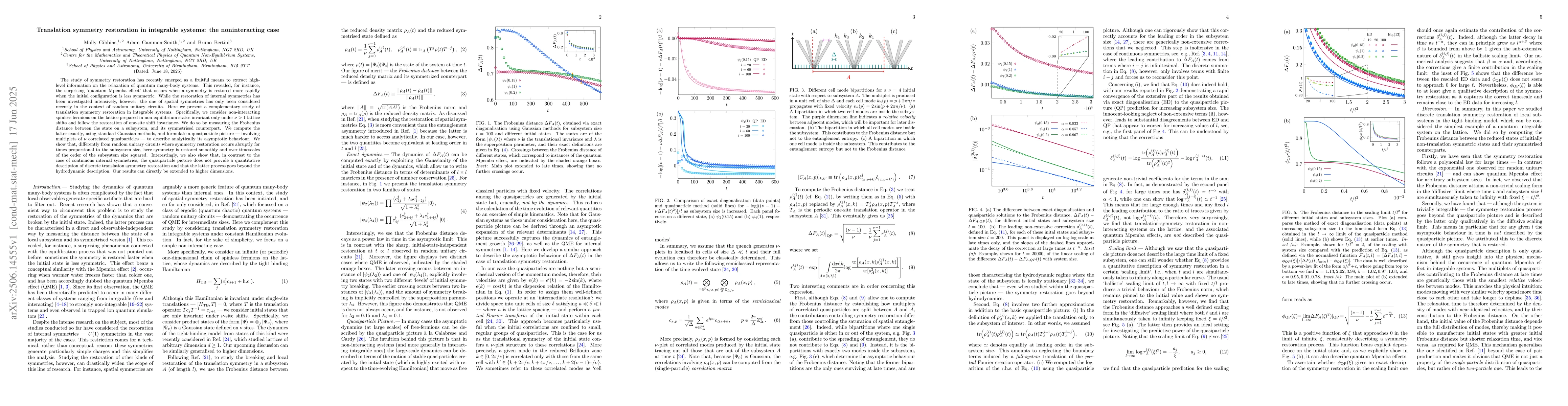 This research explores translation symmetry restoration in non-interacting fermion systems on lattices, initiated from states with $ u > 1$ lattice shifts. The study contrasts this with random unitary circuits, finding smoother, squared-subsystem-size-scale restoration in integrable systems. It also reveals that the quasiparticle picture, effective for continuous internal symmetries, doesn't quantitatively describe discrete translation symmetry restoration, suggesting a departure from hydrodynamic descriptions.