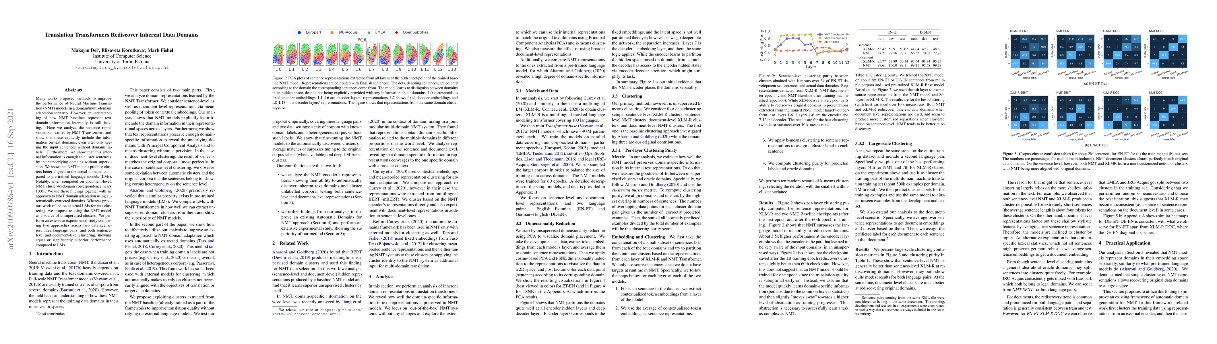 Many works proposed methods to improve the performance of Neural Machine Translation (NMT) models in a domain/multi-domain adaptation scenario. However, an understanding of how NMT baselines represent text domain information internally is still lacking. Here we analyze the sentence representations learned by NMT Transformers and show that these explicitly include the information on text domains, even after only seeing the input sentences without domains labels. Furthermore, we show that this internal information is enough to cluster sentences by their underlying domains without supervision. We show that NMT models produce clusters better aligned to the actual domains compared to pre-trained language models (LMs). Notably, when computed on document-level, NMT cluster-to-domain correspondence nears 100%. We use these findings together with an approach to NMT domain adaptation using automatically extracted domains. Whereas previous work relied on external LMs for text clustering, we propose re-using the NMT model as a source of unsupervised clusters. We perform an extensive experimental study comparing two approaches across two data scenarios, three language pairs, and both sentence-level and document-level clustering, showing equal or significantly superior performance compared to LMs.
