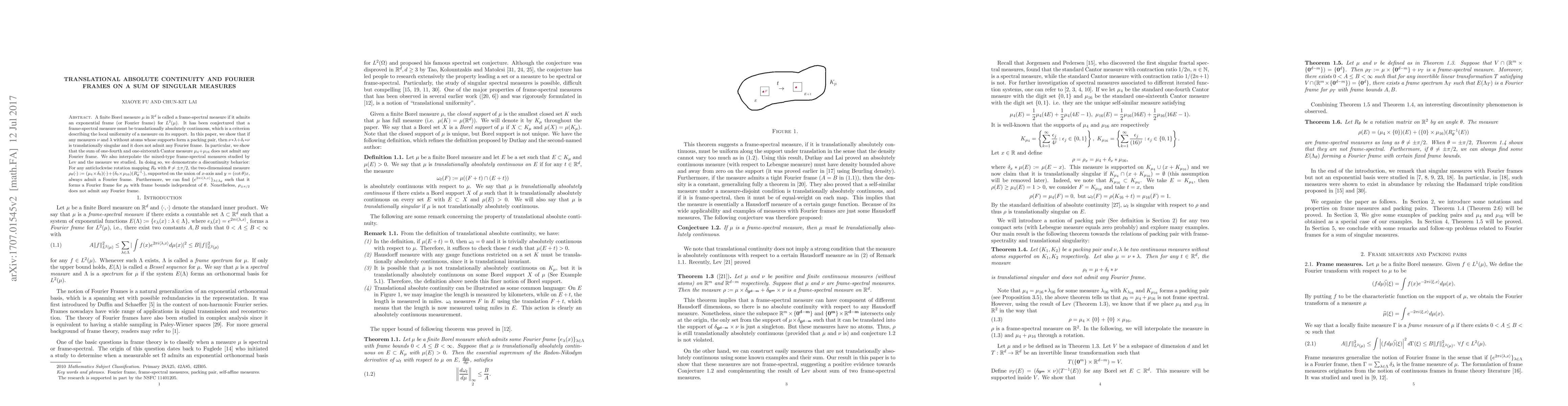 This paper investigates the conjecture that frame-spectral measures must be translationally absolutely continuous. It demonstrates that the sum of one-fourth and one-sixteenth Cantor measures does not admit a Fourier frame, while certain rotated combinations of these measures do, showing a discontinuity in Fourier frame behavior.