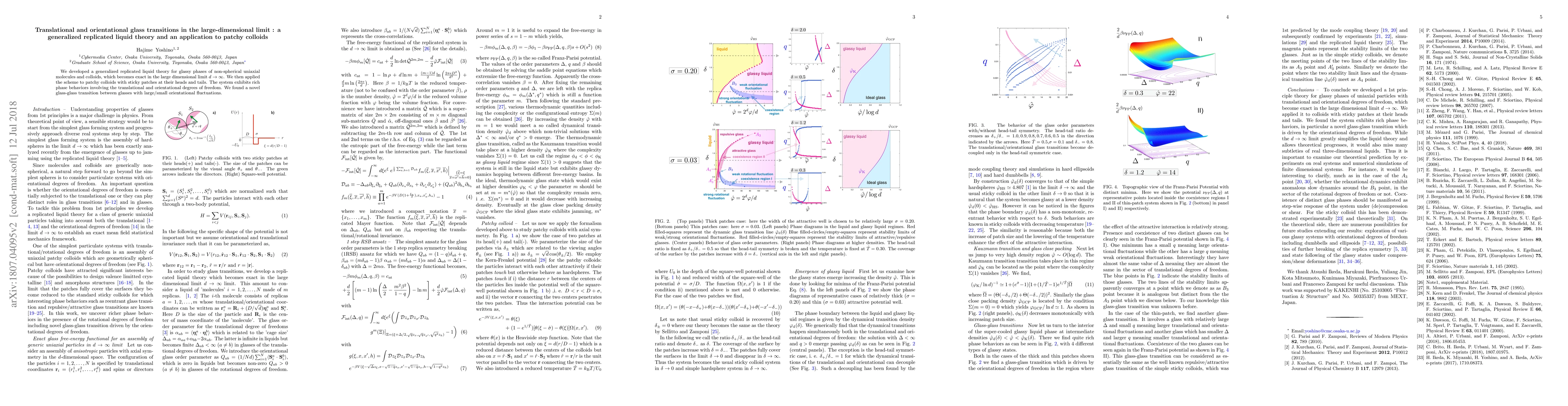 We developed a generalized replicated liquid theory for glassy phases of non-spherical uniaxial molecules and colloids, which becomes exact in the large dimensional limit $d\to\infty$. We then applied the scheme to patchy colloids with sticky patches at their heads and tails. The system exhibits rich phase behaviors involving the translational and orientational degrees of freedom. We found a novel glass-glass transition between glasses with large/small orientational fluctuations.