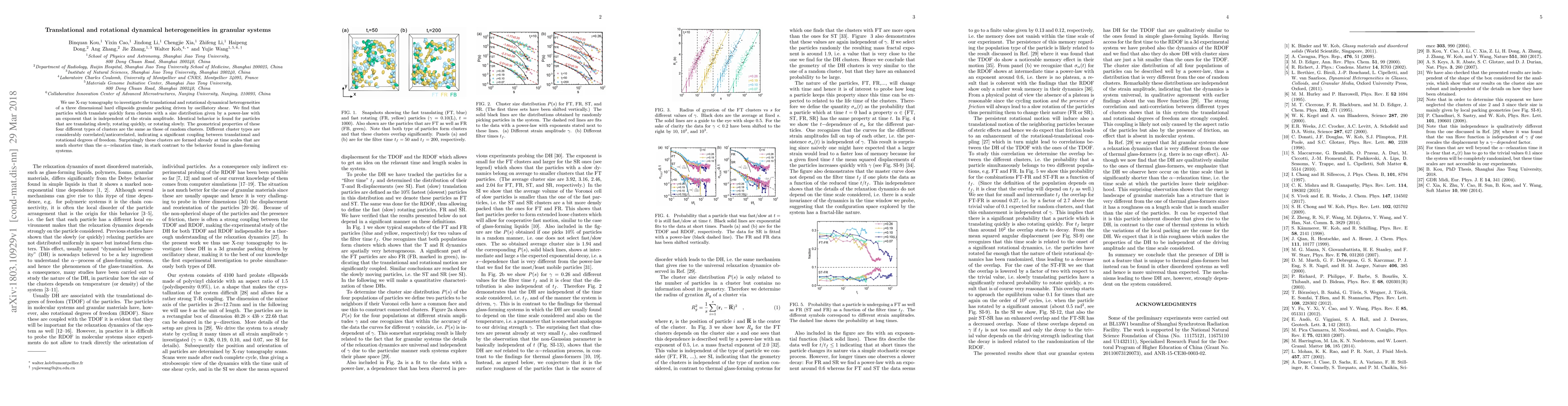 This study employs X-ray tomography to explore the dynamical heterogeneities in a granular packing subjected to oscillatory shear, revealing that fast-translating and fast-rotating particles form clusters with a power-law size distribution. These clusters exhibit geometrical properties akin to random clusters, and show significant coupling between translational and rotational motions, forming much earlier than the $\alpha-$relaxation time, unlike glass-forming systems.