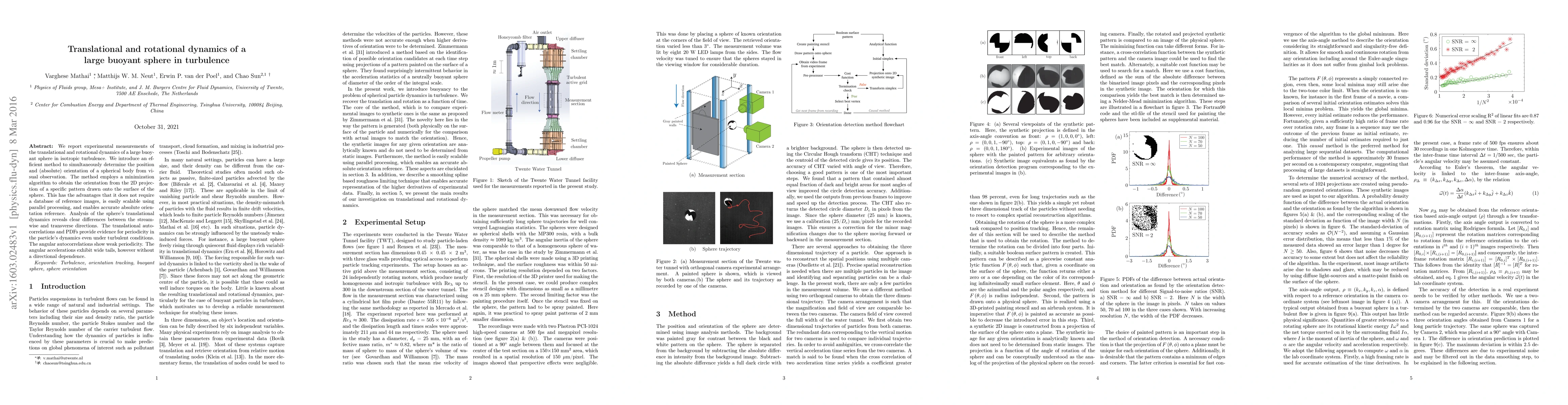 We report experimental measurements of the translational and rotational dynamics of a large buoyant sphere in isotropic turbulence. We introduce an efficient method to simultaneously determine the position and (absolute) orientation of a spherical body from visual observation. The method employs a minimization algorithm to obtain the orientation from the 2D projection of a specific pattern drawn onto the surface of the sphere. This has the advantages that it does not require a database of reference images, is easily scalable using parallel processing, and enables accurate absolute orientation reference. Analysis of the sphere's translational dynamics reveals clear differences between the streamwise and transverse directions. The translational auto-correlations and PDFs provide evidence for periodicity in the particle's dynamics even under turbulent conditions. The angular autocorrelations show weak periodicity. The angular accelerations exhibit wide tails, however without a directional dependence.