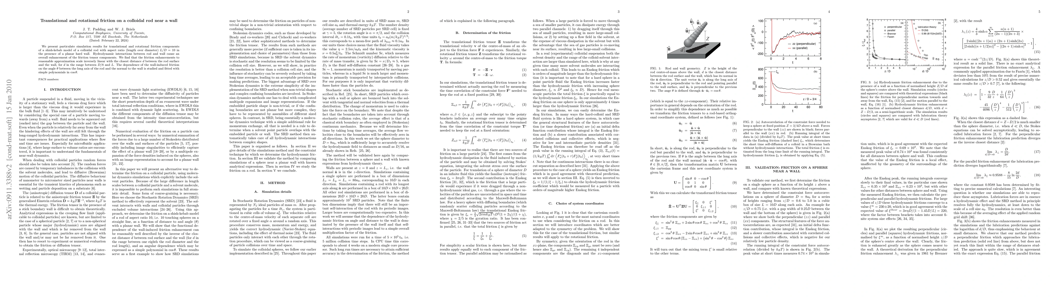 A study found that adding a hard wall near a colloidal rod enhances both translational and rotational friction, with the enhancement decreasing as the distance between the rod and wall increases, and scaling linearly with the angle between the rod's long axis and the wall's normal.