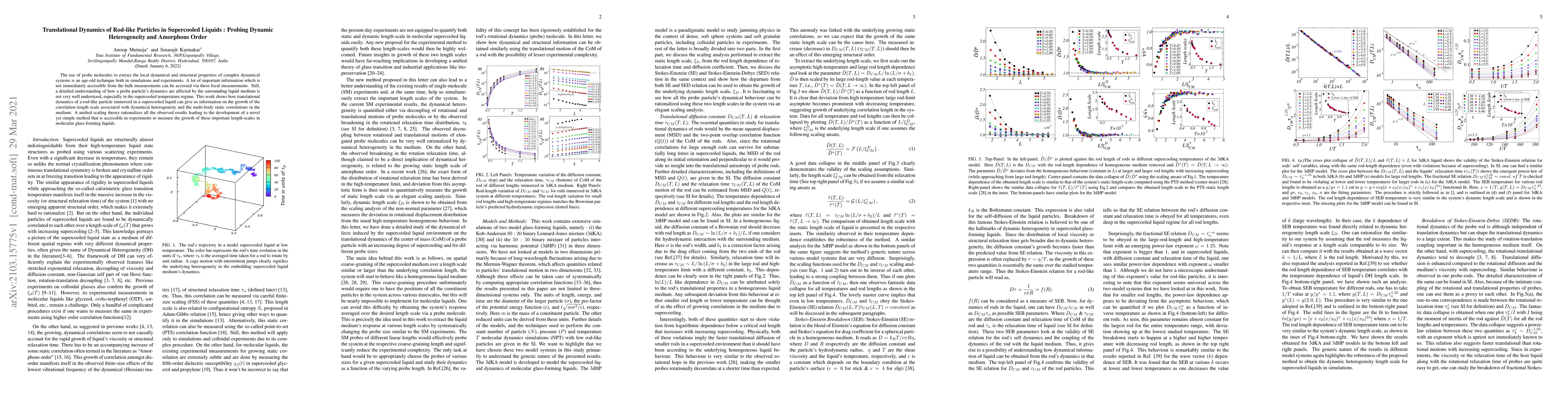 The use of probe molecules to extract the local dynamical and structural properties of complex dynamical systems is an age-old technique both in simulations and experiments. A lot of important information which is not immediately accessible from the bulk measurements can be accessed via these local measurements. Still, a detailed understanding of how a probe particle's dynamics are affected by the surrounding liquid medium is not very well understood, especially in the supercooled temperature regime. This work shows how translational dynamics of a rod-like particle immersed in a supercooled liquid can give us information on the growth of the correlation length scale associated with dynamical heterogeneity and the multi-body static correlations in the medium. A unified scaling theory rationalizes all the observed results leading to the development of a novel yet simple method that is accessible in experiments to measure the growth of these important length-scales in molecular glass-forming liquids.