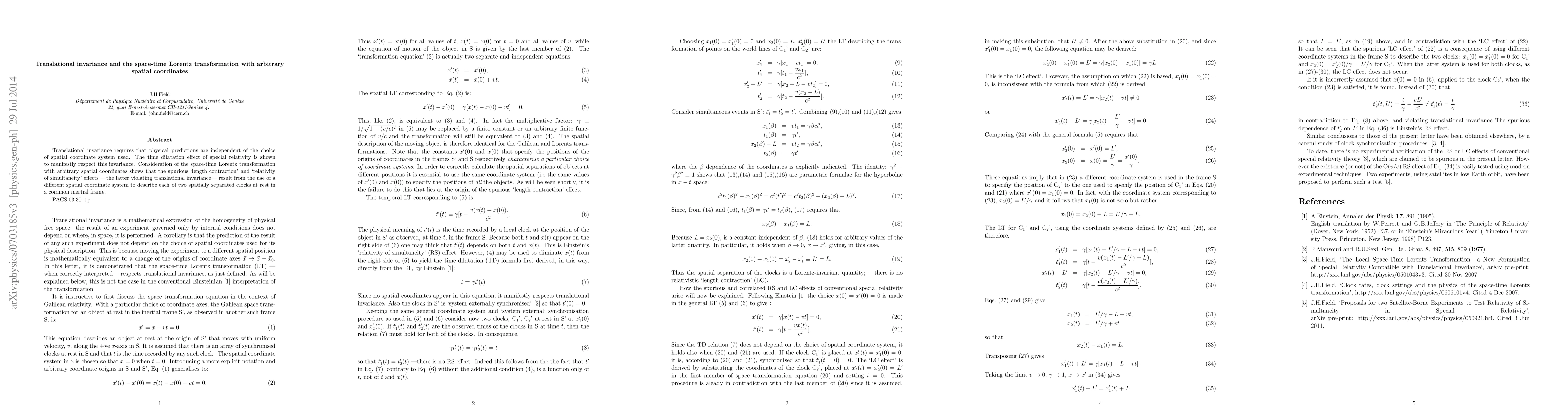 Translational invariance requires that physical predictions are independent of the choice of spatial coordinate system used. The time dilatation effect of special relativity is shown to manifestly respect this invariance. Consideration of the space-time Lorentz transformation with arbitrary spatial coordinates shows that the spurious `length contraction' and `relativity of simultaneity' effects --the latter violating translational invariance-- result from the use of a different spatial coordinate system to describe each of two spatially separated clocks at rest in a common inertial frame