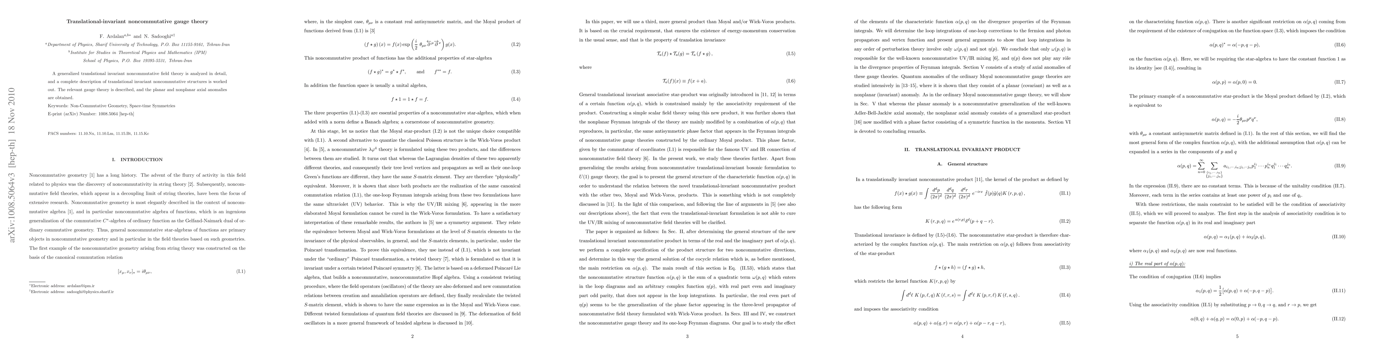 A generalized translational invariant noncommutative field theory is analyzed in detail, and a complete description of translational invariant noncommutative structures is worked out. The relevant gauge theory is described, and the planar and nonplanar axial anomalies are obtained.