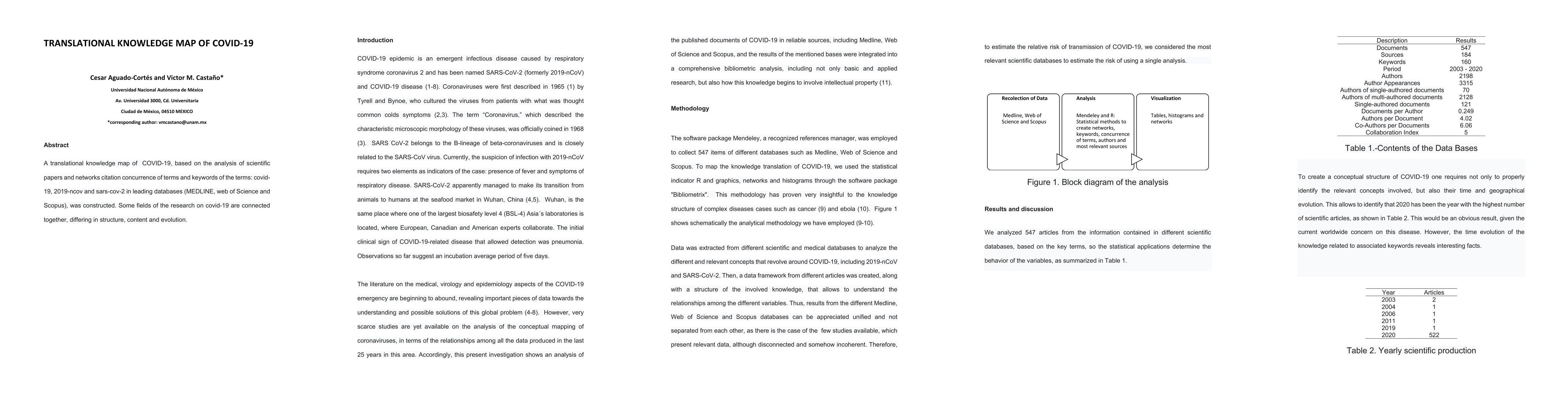 A translational knowledge map of COVID-19, based on the analysis of scientific papers and networks citation concurrence of terms and keywords of the terms: covid- 19, 2019-ncov and sars-cov-2 in leading databases (MEDLINE, web of Science and Scopus), was constructed. Some fields of the research on covid-19 are connected together, differing in structure, content and evolution.
