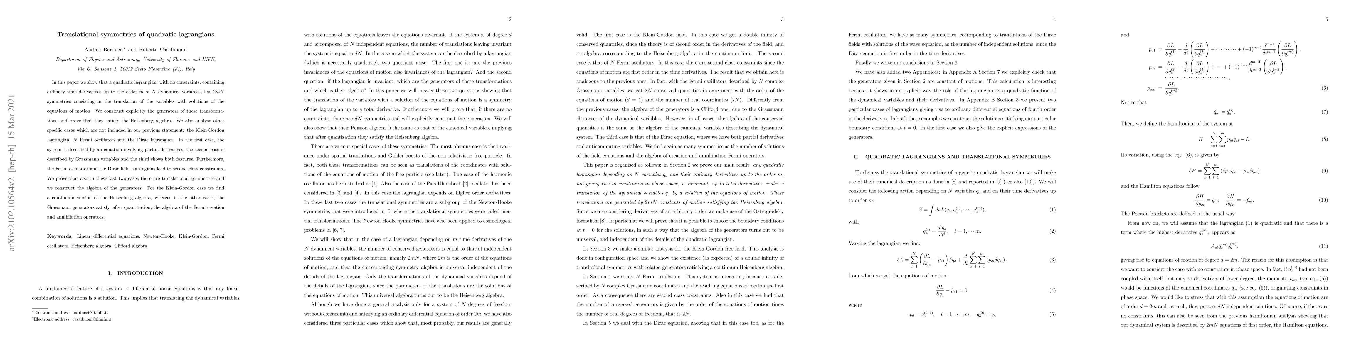 This paper demonstrates that quadratic Lagrangians without constraints possess $2mN$ translational symmetries, where $m$ is the highest derivative order and $N$ is the number of dynamical variables. It constructs the generators for these transformations, proving they follow the Heisenberg algebra, and extends the analysis to specific cases like the Klein-Gordon, Fermi oscillators, and Dirac Lagrangians, revealing additional algebraic structures.