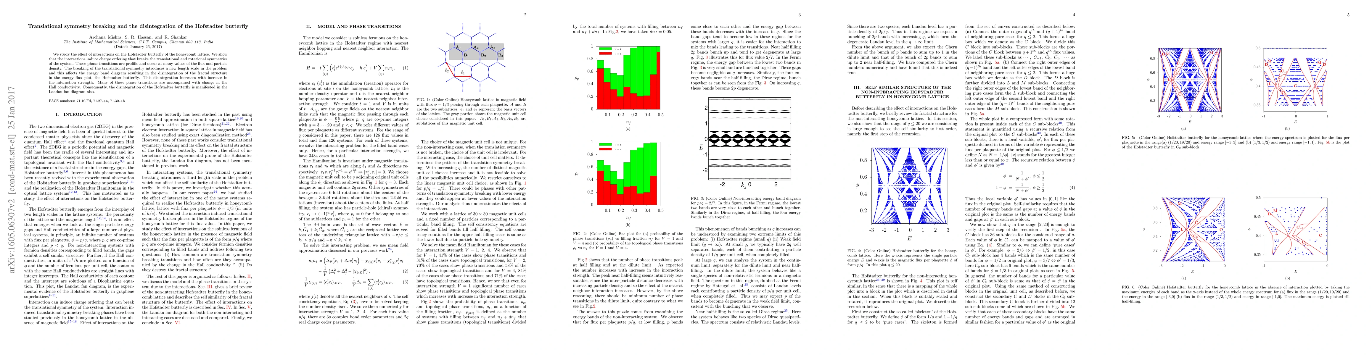 This paper investigates how interactions in a honeycomb lattice affect the Hofstadter butterfly, revealing that they induce charge ordering that breaks translational and rotational symmetries. The resulting phase transitions, occurring at various flux and density levels, lead to a disintegration of the fractal energy band structure, which is further amplified by stronger interactions and alters the Hall conductivity and Landau fan diagram.