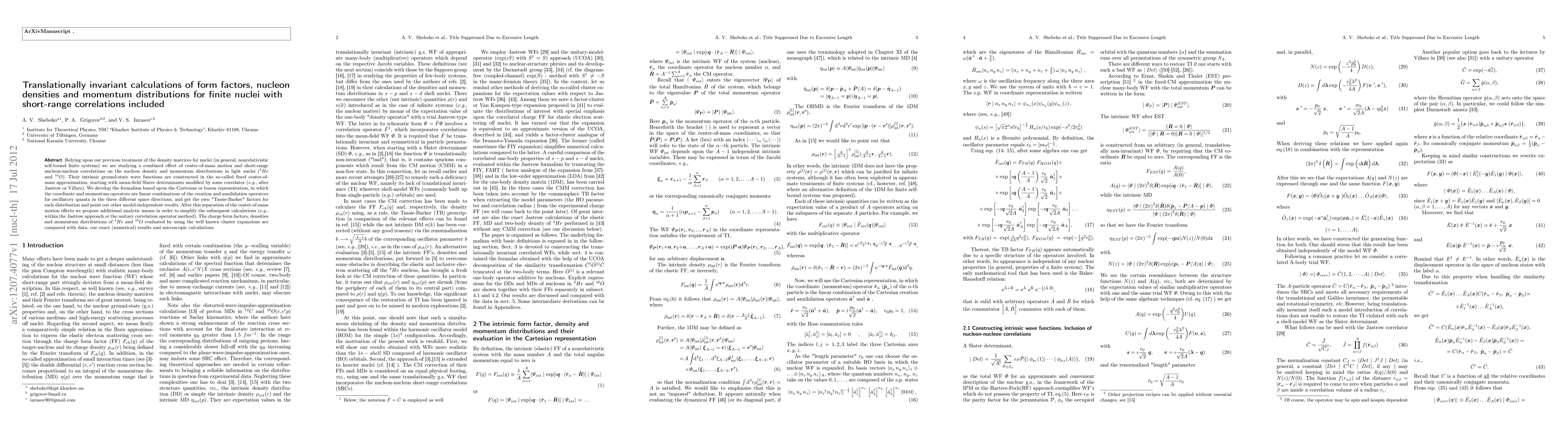 Relying upon our previous treatment of the density matrices for nuclei (in general, nonrelativistic self-bound finite systems) we are studying a combined effect of center-of-mass motion and short-range nucleon-nucleon correlations on the nucleon density and momentum distributions in light nuclei ($^{4}He $ and $^{16}O$). Their intrinsic ground-state wave functions are constructed in the so-called fixed center-of-mass approximation, starting with mean-field Slater determinants modified by some correlator (e.g., after Jastrow or Villars). We develop the formalism based upon the Cartesian or boson representation, in which the coordinate and momentum operators are linear combinations of the creation and annihilation operators for oscillatory quanta in the three different space directions, and get the own "Tassie-Barker" factors for each distribution and point out other model-independent results. After this separation of the center-of-mass motion effects we propose additional analytic means in order to simplify the subsequent calculations (e.g., within the Jastrow approach or the unitary correlation operator method). The charge form factors, densities and momentum distributions of $^{4}He $ and $^{16}O$ evaluated by using the well known cluster expansions are compared with data, our exact (numerical) results and microscopic calculations.