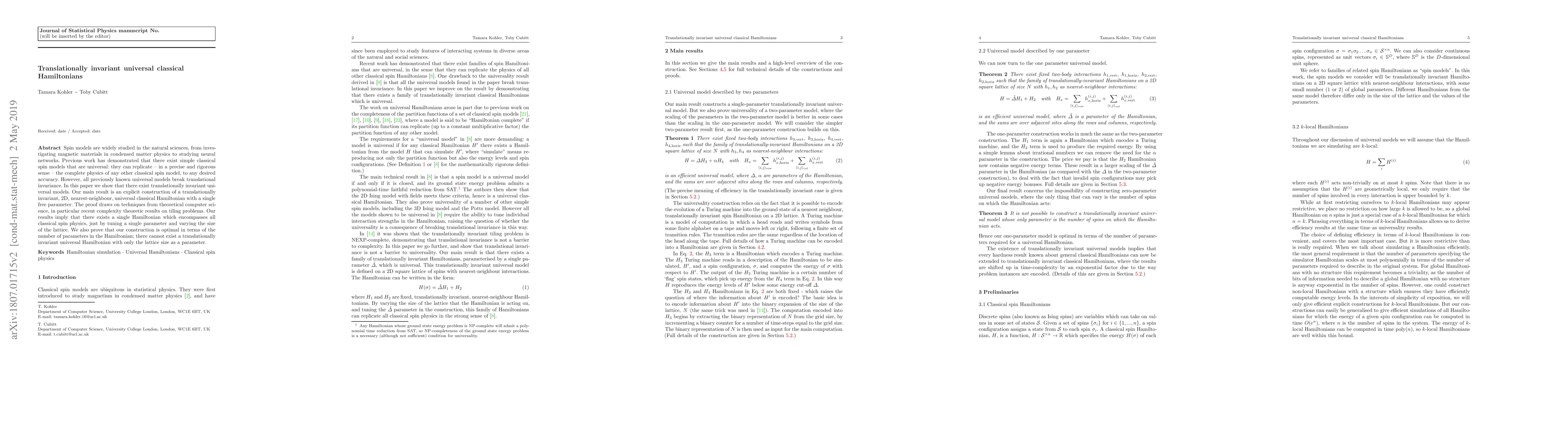 Spin models are widely studied in the natural sciences, from investigating magnetic materials in condensed matter physics to studying neural networks. Previous work has demonstrated that there exist simple classical spin models that are universal: they can replicate -- in a precise and rigorous sense -- the complete physics of any other classical spin model, to any desired accuracy. However, all previously known universal models break translational invariance. In this paper we show that there exist translationally invariant universal models. Our main result is an explicit construction of a translationally invariant, 2D, nearest-neighbour, universal classical Hamiltonian with a single free parameter. The proof draws on techniques from theoretical computer science, in particular recent complexity theoretic results on tiling problems. Our results imply that there exists a single Hamiltonian which encompasses all classical spin physics, just by tuning a single parameter and varying the size of the lattice. We also prove that our construction is optimal in terms of the number of parameters in the Hamiltonian; there cannot exist a translationally invariant universal Hamiltonian with only the lattice size as a parameter.