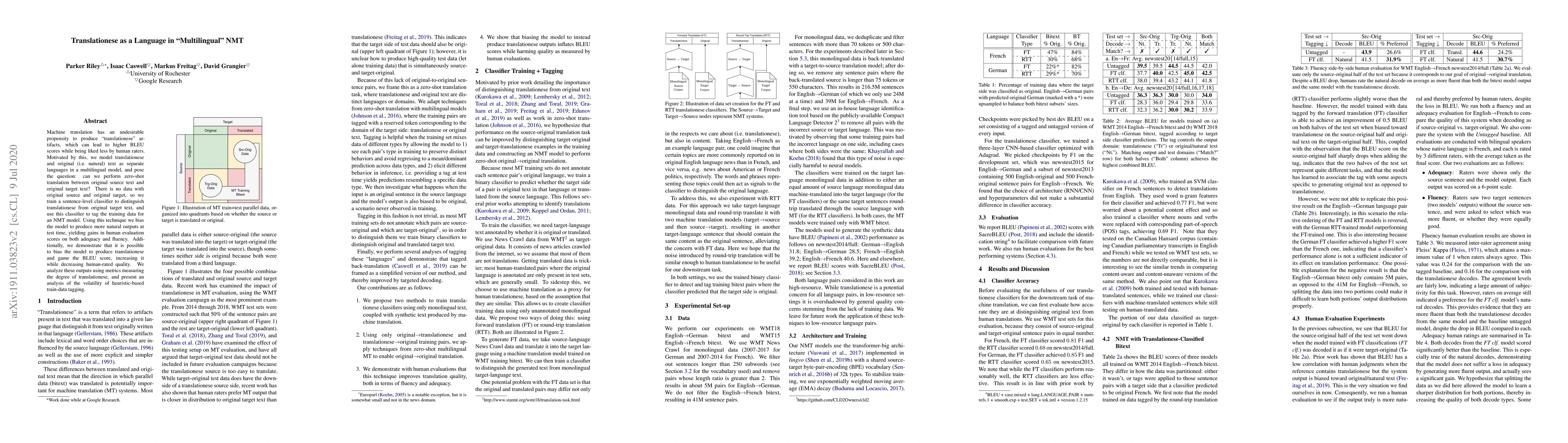 Machine translation has an undesirable propensity to produce "translationese" artifacts, which can lead to higher BLEU scores while being liked less by human raters. Motivated by this, we model translationese and original (i.e. natural) text as separate languages in a multilingual model, and pose the question: can we perform zero-shot translation between original source text and original target text? There is no data with original source and original target, so we train sentence-level classifiers to distinguish translationese from original target text, and use this classifier to tag the training data for an NMT model. Using this technique we bias the model to produce more natural outputs at test time, yielding gains in human evaluation scores on both accuracy and fluency. Additionally, we demonstrate that it is possible to bias the model to produce translationese and game the BLEU score, increasing it while decreasing human-rated quality. We analyze these models using metrics to measure the degree of translationese in the output, and present an analysis of the capriciousness of heuristically-based train-data tagging.