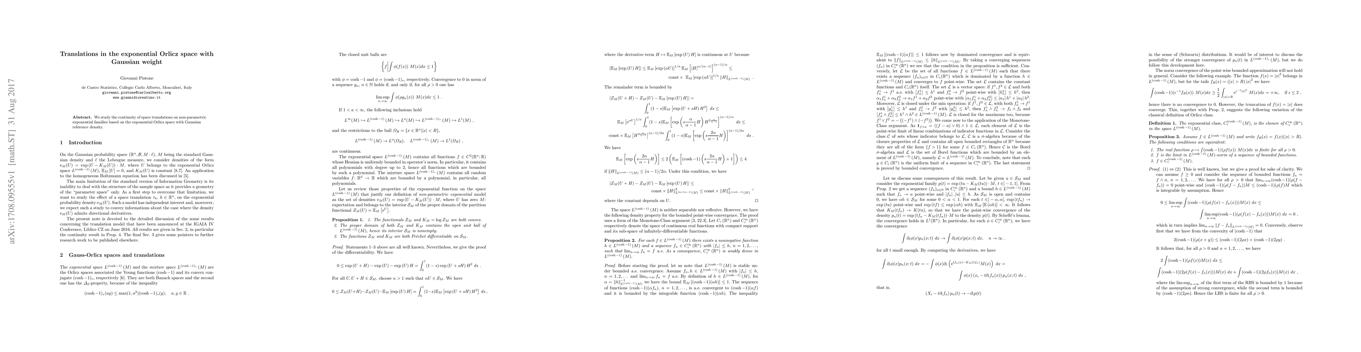 This paper investigates the continuity of space translations on non-parametric exponential families based on the exponential Orlicz space with Gaussian weight, providing key findings on its implications.
