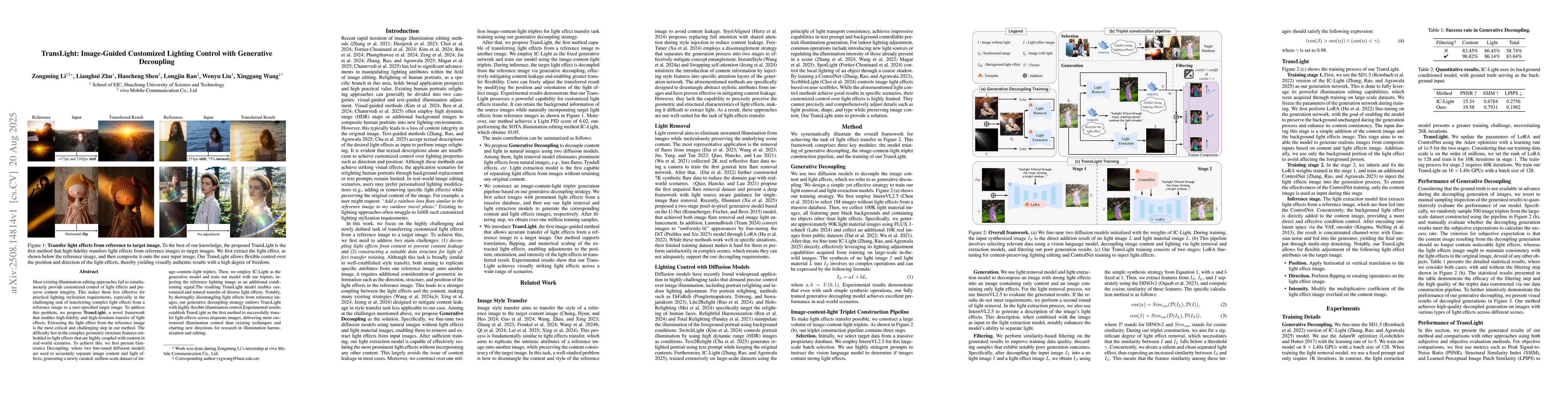 TransLight distinguishes itself by addressing the simultaneous need for customized light control and content preservation, using a novel generative decoupling strategy and a large-scale dataset of image-content-light triplets.