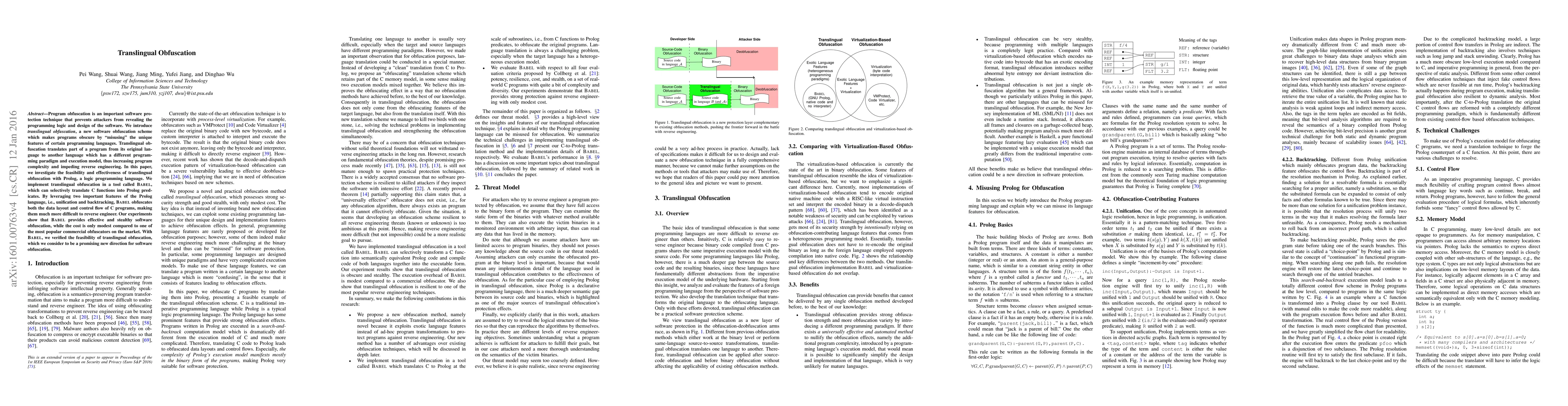 This paper introduces translingual obfuscation, a novel software protection technique that translates parts of a program from one language to another with different paradigms, using Prolog to increase complexity and hinder reverse engineering. The tool BABEL demonstrates effective and stealthy obfuscation with minimal cost compared to commercial alternatives.