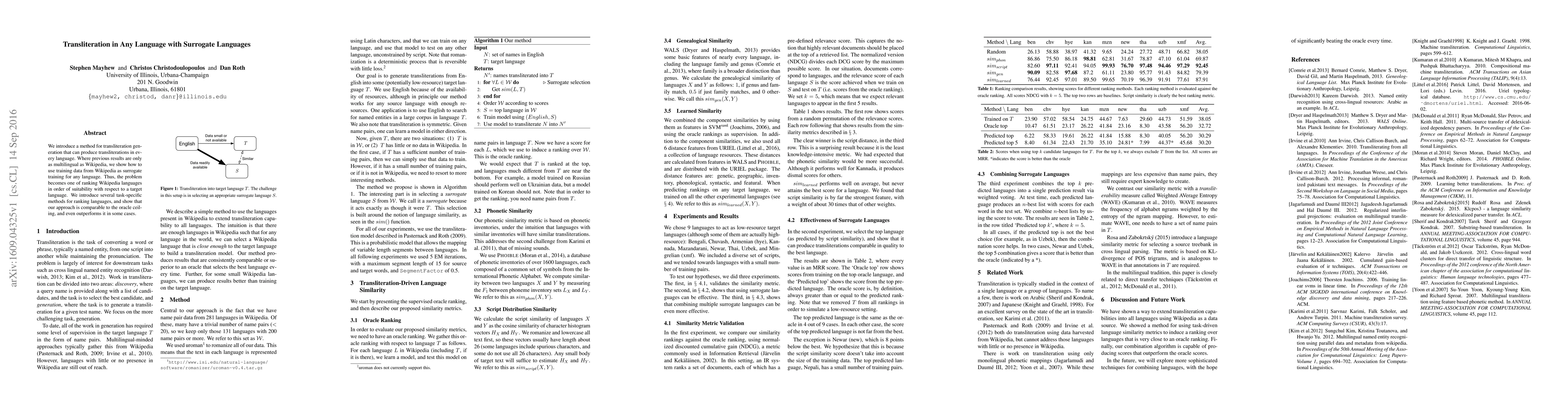 We introduce a method for transliteration generation that can produce transliterations in every language. Where previous results are only as multilingual as Wikipedia, we show how to use training data from Wikipedia as surrogate training for any language. Thus, the problem becomes one of ranking Wikipedia languages in order of suitability with respect to a target language. We introduce several task-specific methods for ranking languages, and show that our approach is comparable to the oracle ceiling, and even outperforms it in some cases.