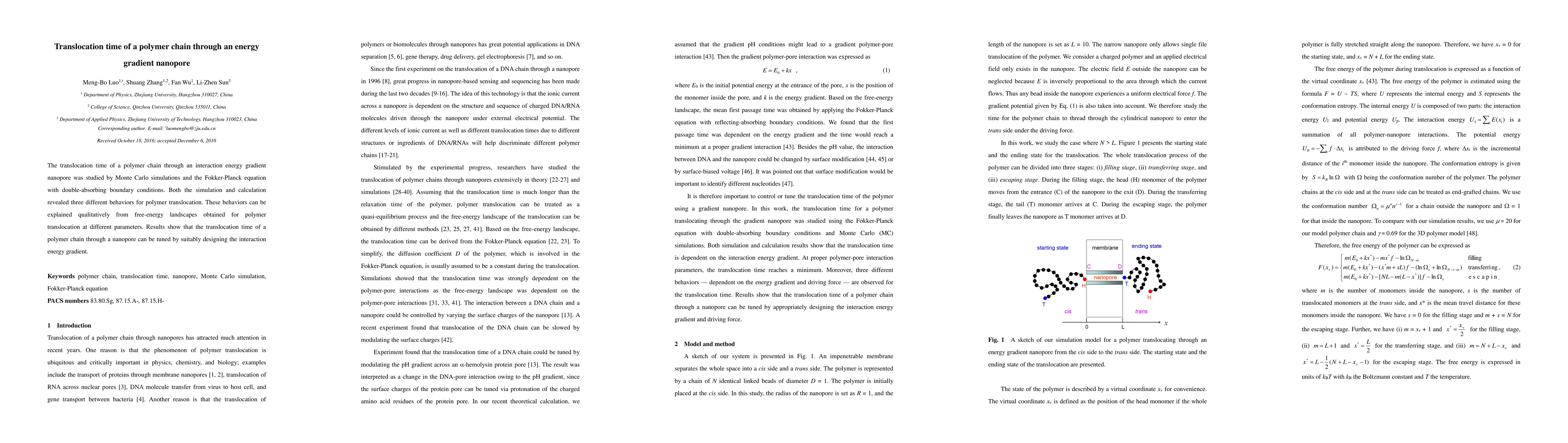 Summary: Monte Carlo simulations and Fokker-Planck equations reveal three distinct behaviors in polymer chain translocation through an energy gradient nanopore, which can be explained by free-energy landscapes. The study demonstrates that the translocation time can be controlled by designing the interaction energy gradient.